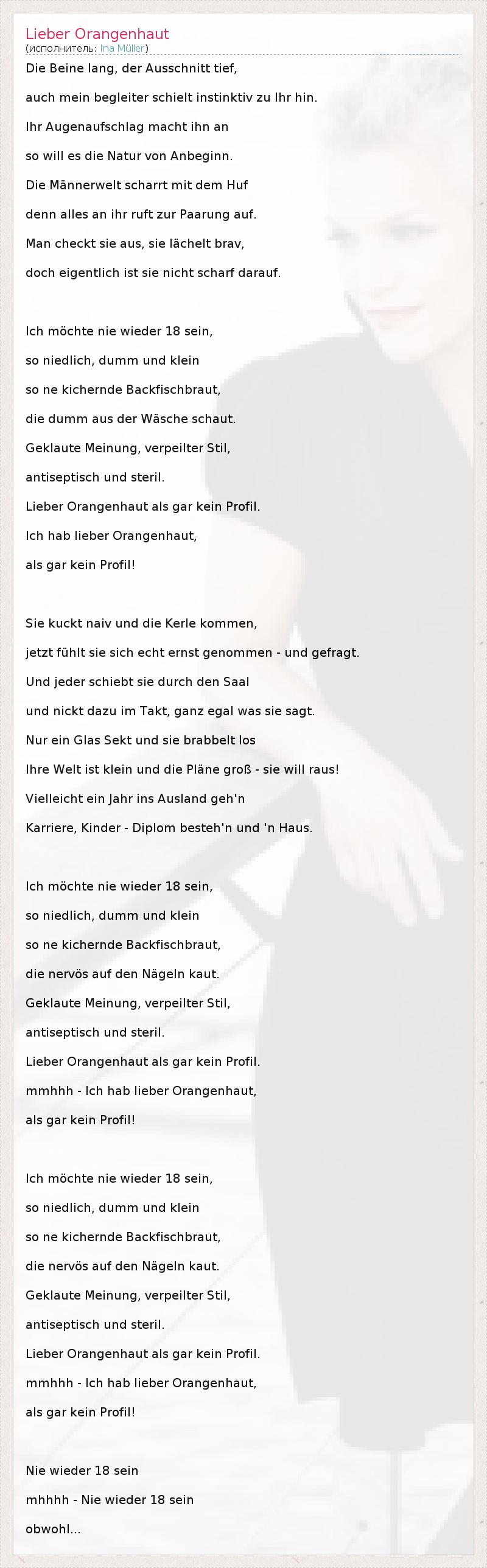 Die Beine lang, der Ausschnitt tief, auch mein begleiter schielt instinktiv zu Ihr hin. Ihr Augenaufschlag macht ihn an so will es die Natur von Anbeginn. Die Männerwelt scharrt mit dem Huf denn alles an ihr ruft zur Paarung auf. Man checkt sie aus, sie lächelt brav, doch eigentlich ist sie nicht scharf darauf. Ich möchte nie wieder 18 sein, so niedlich, dumm und klein so ne kichernde Backfischbraut, die dumm aus der Wäsche schaut. Geklaute Meinung, verpeilter Stil, antiseptisch und steril. Lieber Orangenhaut als gar kein Profil. Ich hab lieber Orangenhaut, als gar kein Profil! Sie kuckt naiv und die Kerle kommen, jetzt fühlt sie sich echt ernst genommen - und gefragt. Und jeder schiebt sie durch den Saal und nickt dazu im Takt, ganz egal was sie sagt. Nur ein Glas Sekt und sie brabbelt los Ihre Welt ist klein und die Pläne groß - sie will raus! Vielleicht ein Jahr ins Ausland geh'n Karriere, Kinder - Diplom besteh'n und 'n Haus. Ich möchte nie wieder 18 sein, so niedlich, dumm und klein so ne kichernde Backfischbraut, die nervös auf den Nägeln kaut. Geklaute Meinung, verpeilter Stil, antiseptisch und steril. Lieber Orangenhaut als gar kein Profil. mmhhh - Ich hab lieber Orangenhaut, als gar kein Profil! Ich möchte nie wieder 18 sein, so niedlich, dumm und klein so ne kichernde Backfischbraut, die nervös auf den Nägeln kaut. Geklaute Meinung, verpeilter Stil, antiseptisch und steril. Lieber Orangenhaut als gar kein Profil. mmhhh - Ich hab lieber Orangenhaut, als gar kein Profil! Nie wieder 18 sein mhhhh - Nie wieder 18 sein obwohl...