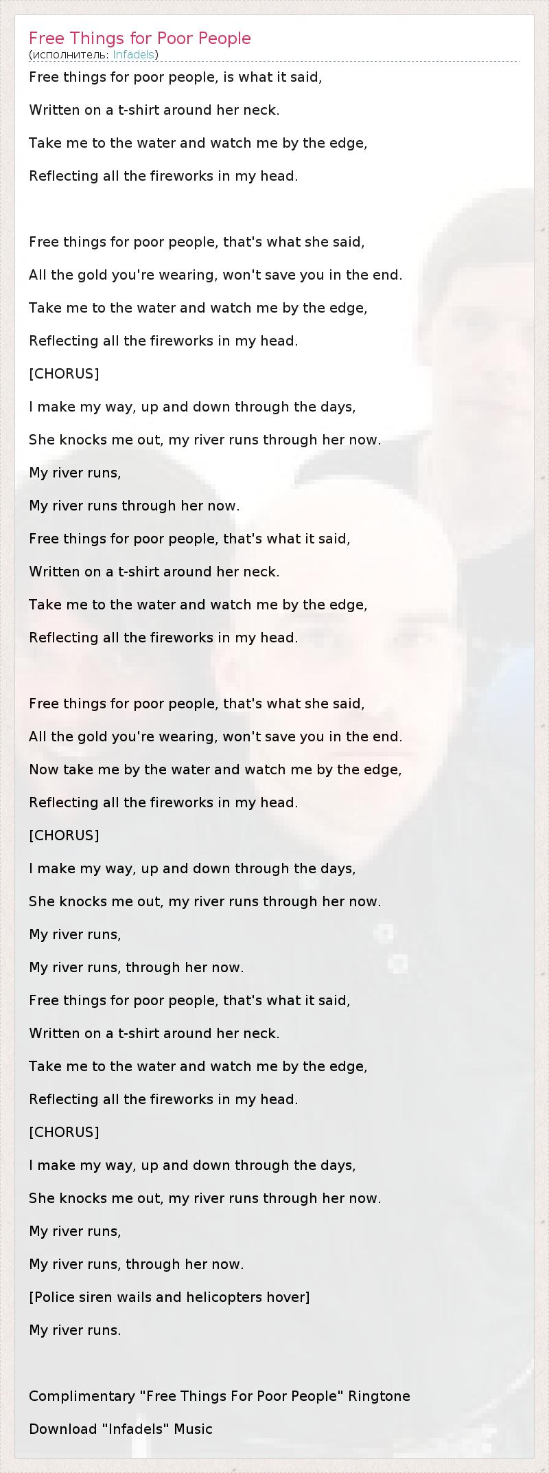 Free things for poor people, is what it said, Written on a t-shirt around her neck. Take me to the water and watch me by the edge, Reflecting all the fireworks in my head. Free things for poor people, that's what she said, All the gold you're wearing, won't save you in the end. Take me to the water and watch me by the edge, Reflecting all the fireworks in my head. [CHORUS] I make my way, up and down through the days, She knocks me out, my river runs through her now. My river runs, My river runs through her now. Free things for poor people, that's what it said, Written on a t-shirt around her neck. Take me to the water and watch me by the edge, Reflecting all the fireworks in my head. Free things for poor people, that's what she said, All the gold you're wearing, won't save you in the end. Now take me by the water and watch me by the edge, Reflecting all the fireworks in my head. [CHORUS] I make my way, up and down through the days, She knocks me out, my river runs through her now. My river runs, My river runs, through her now. Free things for poor people, that's what it said, Written on a t-shirt around her neck. Take me to the water and watch me by the edge, Reflecting all the fireworks in my head. [CHORUS] I make my way, up and down through the days, She knocks me out, my river runs through her now. My river runs, My river runs, through her now. [Police siren wails and helicopters hover] My river runs. Complimentary "Free Things For Poor People" Ringtone Download "Infadels" Music