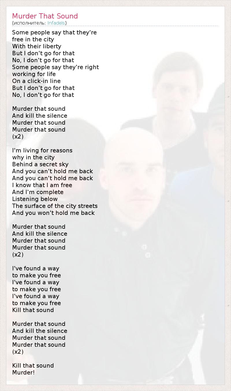 Some people say that they're free in the city With their liberty But I don't go for that No, I don't go for that Some people say they're right working for life On a click-in line But I don't go for that No, I don't go for that Murder that sound And kill the silence Murder that sound Murder that sound (x2) I'm living for reasons why in the city Behind a secret sky And you can't hold me back And you can't hold me back I know that I am free And I'm complete Listening below The surface of the city streets And you won't hold me back Murder that sound And kill the silence Murder that sound Murder that sound (x2) I've found a way to make you free I've found a way to make you free I've found a way to make you free Kill that sound Murder that sound And kill the silence Murder that sound Murder that sound (x2) Kill that sound Murder!
