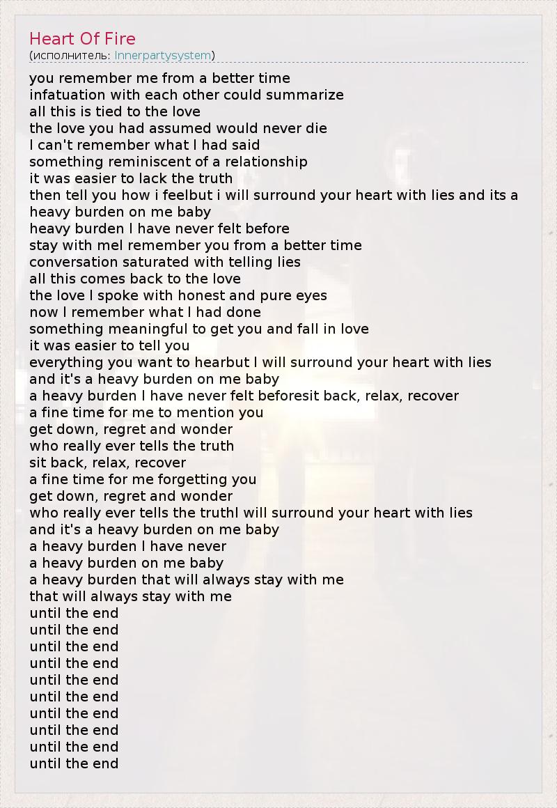 you remember me from a better time infatuation with each other could summarize all this is tied to the love the love you had assumed would never die I can't remember what I had said something reminiscent of a relationship it was easier to lack the truth then tell you how i feelbut i will surround your heart with lies and its a heavy burden on me baby heavy burden I have never felt before stay with meI remember you from a better time conversation saturated with telling lies all this comes back to the love the love I spoke with honest and pure eyes now I remember what I had done something meaningful to get you and fall in love it was easier to tell you everything you want to hearbut I will surround your heart with lies and it's a heavy burden on me baby a heavy burden I have never felt beforesit back, relax, recover a fine time for me to mention you get down, regret and wonder who really ever tells the truth sit back, relax, recover a fine time for me forgetting you get down, regret and wonder who really ever tells the truthI will surround your heart with lies and it's a heavy burden on me baby a heavy burden I have never a heavy burden on me baby a heavy burden that will always stay with me that will always stay with me until the end until the end until the end until the end until the end until the end until the end until the end until the end until the end
