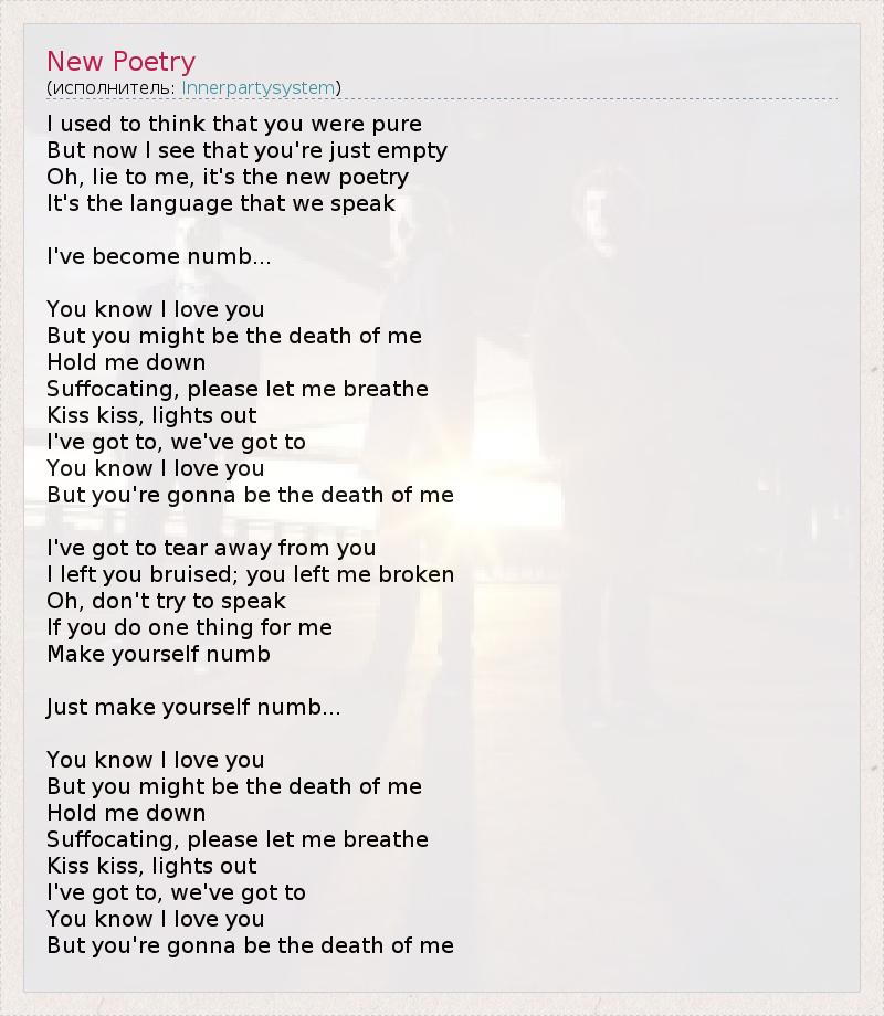 I used to think that you were pure But now I see that you're just empty Oh, lie to me, it's the new poetry It's the language that we speak I've become numb... You know I love you But you might be the death of me Hold me down Suffocating, please let me breathe Kiss kiss, lights out I've got to, we've got to You know I love you But you're gonna be the death of me I've got to tear away from you I left you bruised; you left me broken Oh, don't try to speak If you do one thing for me Make yourself numb Just make yourself numb... You know I love you But you might be the death of me Hold me down Suffocating, please let me breathe Kiss kiss, lights out I've got to, we've got to You know I love you But you're gonna be the death of me