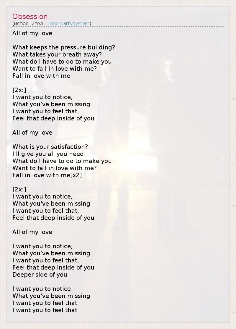 All of my love What keeps the pressure building? What takes your breath away? What do I have to do to make you Want to fall in love with me? Fall in love with me [2x:] I want you to notice, What you've been missing I want you to feel that, Feel that deep inside of you All of my love What is your satisfaction? I'll give you all you need What do I have to do to make you Want to fall in love with me? Fall in love with me[x2] [2x:] I want you to notice, What you've been missing I want you to feel that, Feel that deep inside of you All of my love I want you to notice, What you've been missing I want you to feel that, Feel that deep inside of you Deeper side of you I want you to notice What you've been missing I want you to feel that I want you to feel that