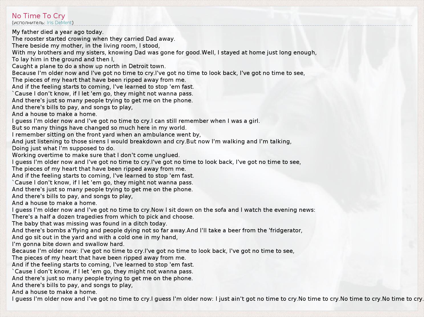 My father died a year ago today. The rooster started crowing when they carried Dad away. There beside my mother, in the living room, I stood, With my brothers and my sisters, knowing Dad was gone for good.Well, I stayed at home just long enough, To lay him in the ground and then I, Caught a plane to do a show up north in Detroit town. Because I'm older now and I've got no time to cry.I've got no time to look back, I've got no time to see, The pieces of my heart that have been ripped away from me. And if the feeling starts to coming, I've learned to stop 'em fast. `Cause I don't know, if I let 'em go, they might not wanna pass. And there's just so many people trying to get me on the phone. And there's bills to pay, and songs to play, And a house to make a home. I guess I'm older now and I've got no time to cry.I can still remember when I was a girl. But so many things have changed so much here in my world. I remember sitting on the front yard when an ambulance went by, And just listening to those sirens I would breakdown and cry.But now I'm walking and I'm talking, Doing just what I'm supposed to do. Working overtime to make sure that I don't come unglued. I guess I'm older now and I've got no time to cry.I've got no time to look back, I've got no time to see, The pieces of my heart that have been ripped away from me. And if the feeling starts to coming, I've learned to stop 'em fast. `Cause I don't know, if I let 'em go, they might not wanna pass. And there's just so many people trying to get me on the phone. And there's bills to pay, and songs to play, And a house to make a home. I guess I'm older now and I've got no time to cry.Now I sit down on the sofa and I watch the evening news: There's a half a dozen tragedies from which to pick and choose. The baby that was missing was found in a ditch today. And there's bombs a'flying and people dying not so far away.And I'll take a beer from the 'fridgerator, And go sit out in the yard and with a cold one in my hand, I'm gonna bite down and swallow hard. Because I'm older now: I've got no time to cry.I've got no time to look back, I've got no time to see, The pieces of my heart that have been ripped away from me. And if the feeling starts to coming, I've learned to stop 'em fast. `Cause I don't know, if I let 'em go, they might not wanna pass. And there's just so many people trying to get me on the phone. And there's bills to pay, and songs to play, And a house to make a home. I guess I'm older now and I've got no time to cry.I guess I'm older now: I just ain't got no time to cry.No time to cry.No time to cry.No time to cry.
