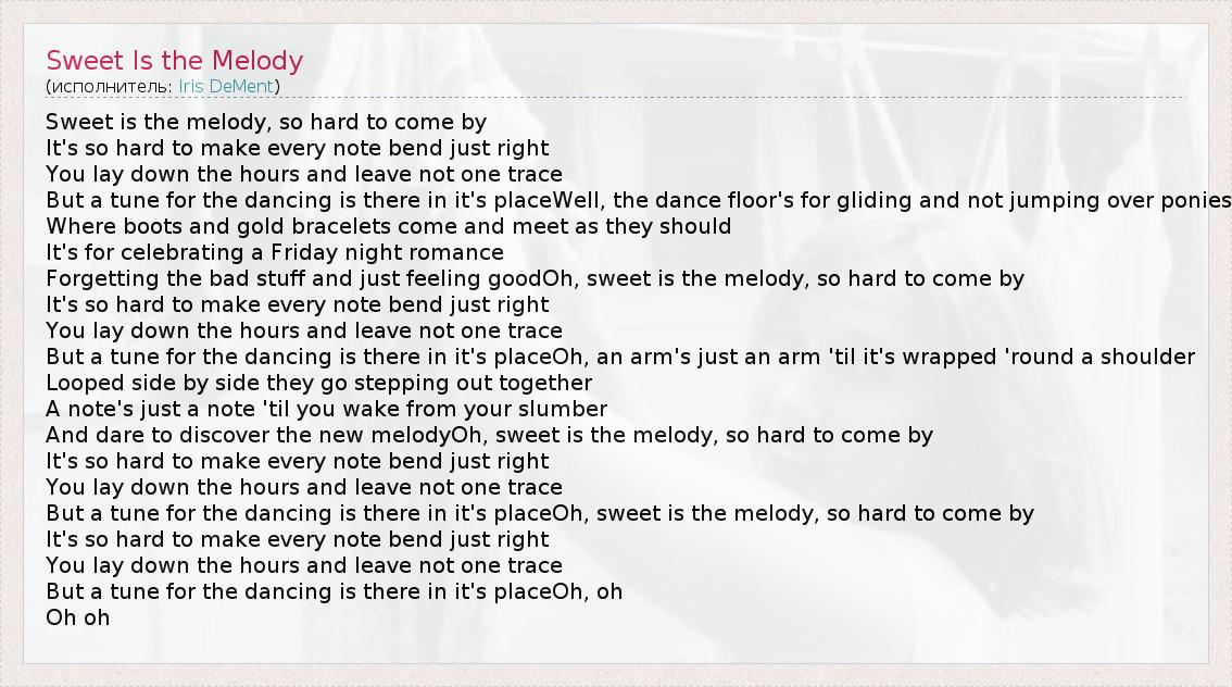 Sweet is the melody, so hard to come by It's so hard to make every note bend just right You lay down the hours and leave not one trace But a tune for the dancing is there in it's placeWell, the dance floor's for gliding and not jumping over ponies Where boots and gold bracelets come and meet as they should It's for celebrating a Friday night romance Forgetting the bad stuff and just feeling goodOh, sweet is the melody, so hard to come by It's so hard to make every note bend just right You lay down the hours and leave not one trace But a tune for the dancing is there in it's placeOh, an arm's just an arm 'til it's wrapped 'round a shoulder Looped side by side they go stepping out together A note's just a note 'til you wake from your slumber And dare to discover the new melodyOh, sweet is the melody, so hard to come by It's so hard to make every note bend just right You lay down the hours and leave not one trace But a tune for the dancing is there in it's placeOh, sweet is the melody, so hard to come by It's so hard to make every note bend just right You lay down the hours and leave not one trace But a tune for the dancing is there in it's placeOh, oh Oh oh