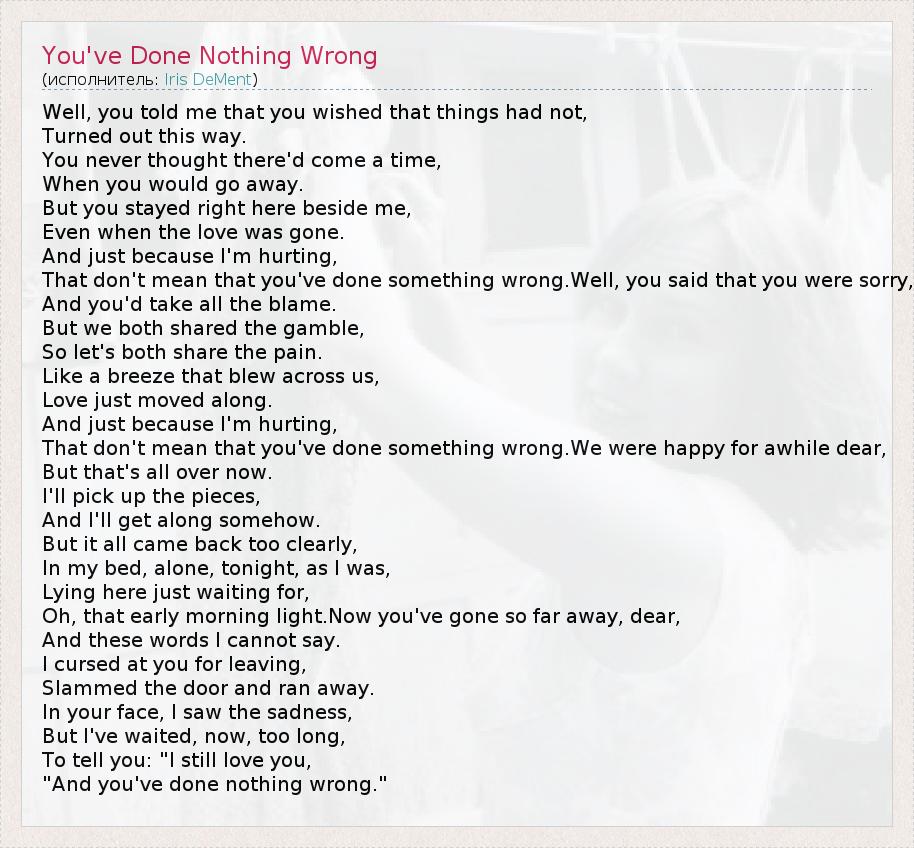 Well, you told me that you wished that things had not, Turned out this way. You never thought there'd come a time, When you would go away. But you stayed right here beside me, Even when the love was gone. And just because I'm hurting, That don't mean that you've done something wrong.Well, you said that you were sorry, And you'd take all the blame. But we both shared the gamble, So let's both share the pain. Like a breeze that blew across us, Love just moved along. And just because I'm hurting, That don't mean that you've done something wrong.We were happy for awhile dear, But that's all over now. I'll pick up the pieces, And I'll get along somehow. But it all came back too clearly, In my bed, alone, tonight, as I was, Lying here just waiting for, Oh, that early morning light.Now you've gone so far away, dear, And these words I cannot say. I cursed at you for leaving, Slammed the door and ran away. In your face, I saw the sadness, But I've waited, now, too long, To tell you: "I still love you, "And you've done nothing wrong."