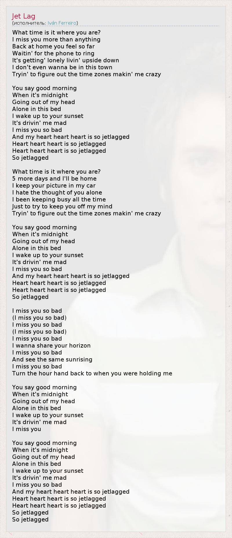 What time is it where you are? I miss you more than anything Back at home you feel so far Waitin' for the phone to ring It's getting' lonely livin' upside down I don't even wanna be in this town Tryin' to figure out the time zones makin' me crazy You say good morning When it's midnight Going out of my head Alone in this bed I wake up to your sunset It's drivin' me mad I miss you so bad And my heart heart heart is so jetlagged Heart heart heart is so jetlagged Heart heart heart is so jetlagged So jetlagged What time is it where you are? 5 more days and I'll be home I keep your picture in my car I hate the thought of you alone I been keeping busy all the time Just to try to keep you off my mind Tryin' to figure out the time zones makin' me crazy You say good morning When it's midnight Going out of my head Alone in this bed I wake up to your sunset It's drivin' me mad I miss you so bad And my heart heart heart is so jetlagged Heart heart heart is so jetlagged Heart heart heart is so jetlagged So jetlagged I miss you so bad (I miss you so bad) I miss you so bad (I miss you so bad) I miss you so bad I wanna share your horizon I miss you so bad And see the same sunrising I miss you so bad Turn the hour hand back to when you were holding me You say good morning When it's midnight Going out of my head Alone in this bed I wake up to your sunset It's drivin' me mad I miss you You say good morning When it's midnight Going out of my head Alone in this bed I wake up to your sunset It's drivin' me mad I miss you so bad And my heart heart heart is so jetlagged Heart heart heart is so jetlagged Heart heart heart is so jetlagged So jetlagged So jetlagged
