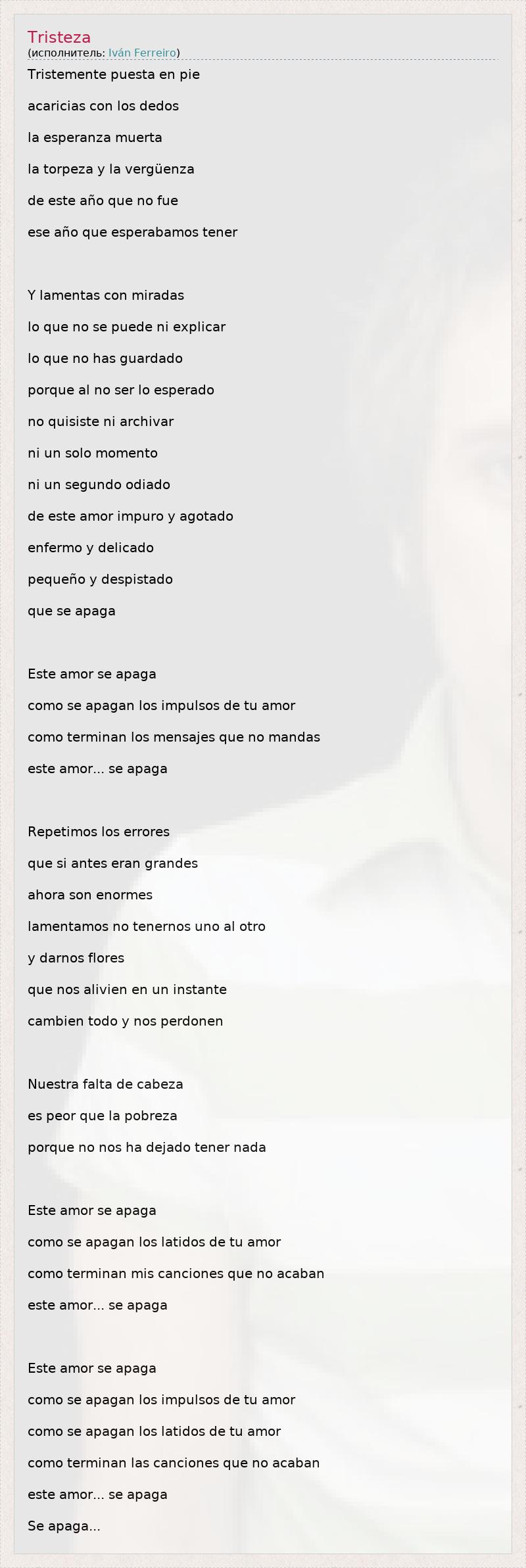Tristemente puesta en pie acaricias con los dedos la esperanza muerta la torpeza y la vergüenza de este año que no fue ese año que esperabamos tener Y lamentas con miradas lo que no se puede ni explicar lo que no has guardado porque al no ser lo esperado no quisiste ni archivar ni un solo momento ni un segundo odiado de este amor impuro y agotado enfermo y delicado pequeño y despistado que se apaga Este amor se apaga como se apagan los impulsos de tu amor como terminan los mensajes que no mandas este amor... se apaga Repetimos los errores que si antes eran grandes ahora son enormes lamentamos no tenernos uno al otro y darnos flores que nos alivien en un instante cambien todo y nos perdonen Nuestra falta de cabeza es peor que la pobreza porque no nos ha dejado tener nada Este amor se apaga como se apagan los latidos de tu amor como terminan mis canciones que no acaban este amor... se apaga Este amor se apaga como se apagan los impulsos de tu amor como se apagan los latidos de tu amor como terminan las canciones que no acaban este amor... se apaga Se apaga...