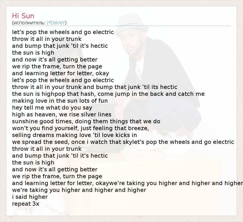 let's pop the wheels and go electric throw it all in your trunk and bump that junk 'til it's hectic the sun is high and now it's all getting better we rip the frame, turn the page and learning letter for letter, okay let's pop the wheels and go electric throw it all in your trunk and bump that junk 'til its hectic the sun is highpop that hash, come jump in the back and catch me making love in the sun lots of fun hey tell me what do you say high as heaven, we rise silver lines sunshine good times, doing them things that we do won't you find yourself, just feeling that breeze, selling dreams making love 'til love kicks in we spread the seed, once i watch that skylet's pop the wheels and go electric throw it all in your trunk and bump that junk 'til it's hectic the sun is high and now it's all getting better we rip the frame, turn the page and learning letter for letter, okaywe're taking you higher and higher and higher we're taking you higher and higher and higher i said higher repeat 3x