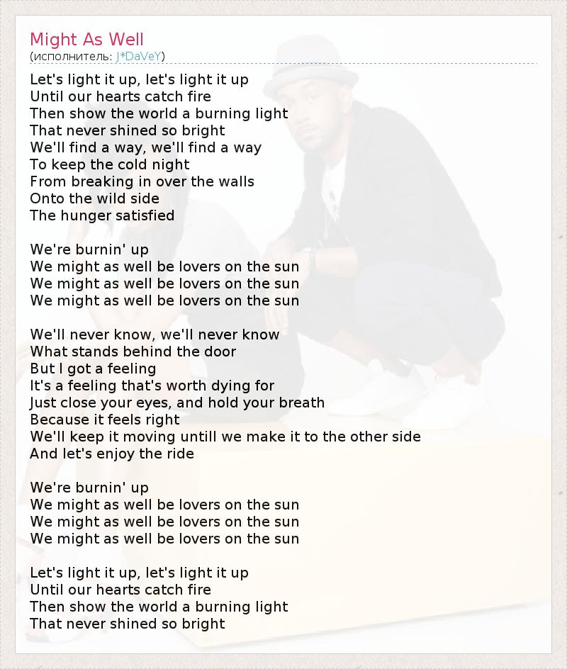 Let's light it up, let's light it up Until our hearts catch fire Then show the world a burning light That never shined so bright We'll find a way, we'll find a way To keep the cold night From breaking in over the walls Onto the wild side The hunger satisfied We're burnin' up We might as well be lovers on the sun We might as well be lovers on the sun We might as well be lovers on the sun We'll never know, we'll never know What stands behind the door But I got a feeling It's a feeling that's worth dying for Just close your eyes, and hold your breath Because it feels right We'll keep it moving untill we make it to the other side And let's enjoy the ride We're burnin' up We might as well be lovers on the sun We might as well be lovers on the sun We might as well be lovers on the sun Let's light it up, let's light it up Until our hearts catch fire Then show the world a burning light That never shined so bright
