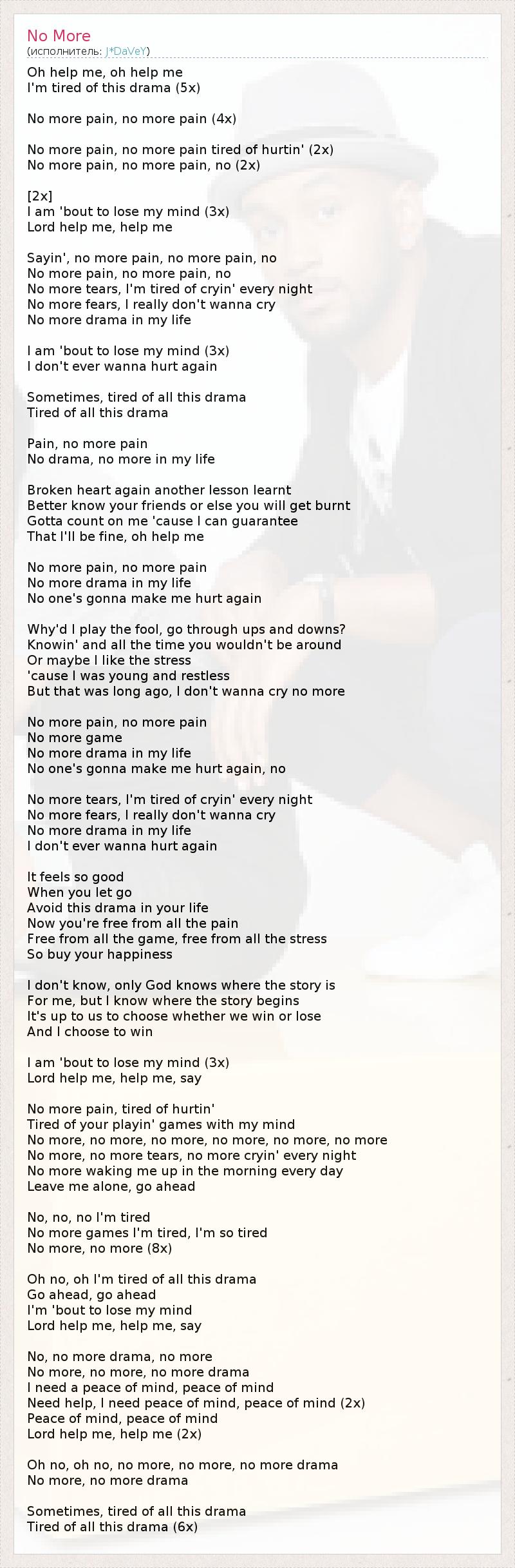 О, помоги мне, помоги мне, Я устала от этой драмы (5 раз) Больше никакой боли, больше никакой боли (4 раза) Больше никакой боли, больше никакой боли, я устала страдать (2 раза) Больше никакой боли, больше никакой боли (2 раза) [2 раза] Я вот-вот сойду с ума (3 раза) Боже, помоги мне, помоги мне! Говорю: больше никакой боли, больше никакой боли, нет! Больше никакой боли, больше никакой боли, нет! Больше никаких слёз, я устала плакать каждую ночь. Больше никаких страхов, я действительно не хочу больше плакать - Больше не будет драмы в моей жизни. Я вот-вот сойду с ума (3 раза) Я больше не хочу страдать. Иногда я чувствую себя уставшей от этой драмы, Уставшей от этой драмы. Боль, больше никакой боли, Никакой драмы больше не будет в моей жизни. Снова разбитое сердце - ещё один выученный урок. Лучше знай своих друзей или обожжёшься. Можешь рассчитывать на меня, потому что я могу гарантировать, Что буду в порядке, о, помоги мне! Больше никакой боли, больше никакой боли, Больше никакой драмы в моей жизни. Больше никто не причинит мне боль. Зачем я притворялась дурочкой, переживала взлёты и падения, Зная все время, что ты не будешь рядом. Или, может, мне нравилость испытывать стресс, Ведь я была юной и неугомонной. Но это было давно, и я больше не хочу плакать. Больше никакой боли, больше никакой боли, Больше никаких игры, Больше никакой драмы в моей жизни. Больше никто не причинит мне боль, нет! Больше никаких слёз, я устала плакать каждую ночь. Больше никаких страхов, я действительно не хочу больше плакать - Больше не будет драмы в моей жизни. Я больше не хочу страдать. Это такое приятное чувство, Когда тебе удаётся отпустить прошлое. Избегай в последующем подобной драмы, Теперь ты свободна от всей этой боли, Свободна от игр, свободна от стресса, Так обрети свое счастье... Я не знаю... Один Бог знает, где закончится Моя история, но я знаю, где она началась. Нам выбирать, выиграем мы или проиграем - Но я выбираю победу. Я вот-вот сойду с ума (3 раза) Боже, помоги мне, помоги мне! Больше не будет боли, я устала страдать, Устала от того, что ты паришь мне мозг. Больше не будет, не будет, не будет, Не будет, больше не будет слёз, больше не буду плакать каждую ночь. Ты больше не будешь будить меня по утрам, Оставь меня в покое, валяй! Нет, нет, я устала, Больше не будет игр, я устала, я так устала, Больше не будет, ничего не будет (8 раз) Нет, нет, я устала от этой драмы, Давай, вперёд. Я вот-вот сойду с ума, Я больше не хочу страдать. Больше никакой драмы, никакой, Никакой, никакой драмы. Мне нужно душевное спокойствие. Мне нужна помощь, мне нужно душевное спокойствие (2 раза) Душевное спокойствие, душевное спокойствие, Боже, помоги мне, помоги мне (2 раза) О, нет, о, нет, больше никакой драмы, Больше никакой драмы. Иногда я чувствую себя уставшей от этой драмы, Устала от всей этой драмы (6 раз)