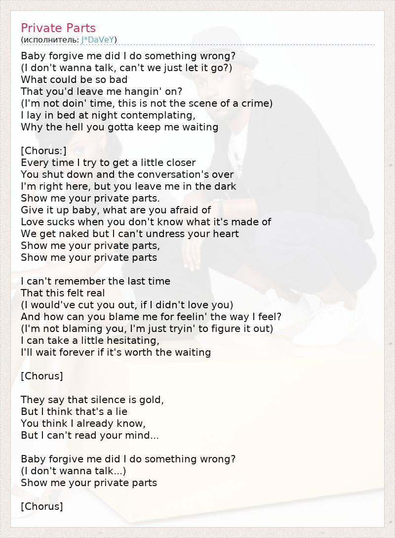 Baby forgive me did I do something wrong? (I don't wanna talk, can't we just let it go?) What could be so bad That you'd leave me hangin' on? (I'm not doin' time, this is not the scene of a crime) I lay in bed at night contemplating, Why the hell you gotta keep me waiting [Chorus:] Every time I try to get a little closer You shut down and the conversation's over I'm right here, but you leave me in the dark Show me your private parts. Give it up baby, what are you afraid of Love sucks when you don't know what it's made of We get naked but I can't undress your heart Show me your private parts, Show me your private parts I can't remember the last time That this felt real (I would've cut you out, if I didn't love you) And how can you blame me for feelin' the way I feel? (I'm not blaming you, I'm just tryin' to figure it out) I can take a little hesitating, I'll wait forever if it's worth the waiting [Chorus] They say that silence is gold, But I think that's a lie You think I already know, But I can't read your mind... Baby forgive me did I do something wrong? (I don't wanna talk...) Show me your private parts [Chorus]