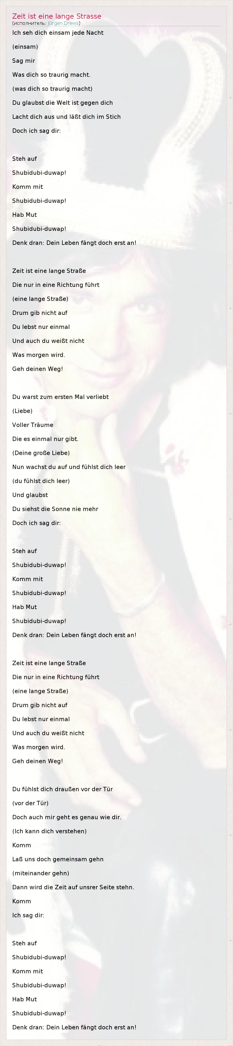 Ich seh dich einsam jede Nacht (einsam) Sag mir Was dich so traurig macht. (was dich so traurig macht) Du glaubst die Welt ist gegen dich Lacht dich aus und läßt dich im Stich Doch ich sag dir: Steh auf Shubidubi-duwap! Komm mit Shubidubi-duwap! Hab Mut Shubidubi-duwap! Denk dran: Dein Leben fängt doch erst an! Zeit ist eine lange Straße Die nur in eine Richtung führt (eine lange Straße) Drum gib nicht auf Du lebst nur einmal Und auch du weißt nicht Was morgen wird. Geh deinen Weg! Du warst zum ersten Mal verliebt (Liebe) Voller Träume Die es einmal nur gibt. (Deine große Liebe) Nun wachst du auf und fühlst dich leer (du fühlst dich leer) Und glaubst Du siehst die Sonne nie mehr Doch ich sag dir: Steh auf Shubidubi-duwap! Komm mit Shubidubi-duwap! Hab Mut Shubidubi-duwap! Denk dran: Dein Leben fängt doch erst an! Zeit ist eine lange Straße Die nur in eine Richtung führt (eine lange Straße) Drum gib nicht auf Du lebst nur einmal Und auch du weißt nicht Was morgen wird. Geh deinen Weg! Du fühlst dich draußen vor der Tür (vor der Tür) Doch auch mir geht es genau wie dir. (Ich kann dich verstehen) Komm Laß uns doch gemeinsam gehn (miteinander gehn) Dann wird die Zeit auf unsrer Seite stehn. Komm Ich sag dir: Steh auf Shubidubi-duwap! Komm mit Shubidubi-duwap! Hab Mut Shubidubi-duwap! Denk dran: Dein Leben fängt doch erst an!