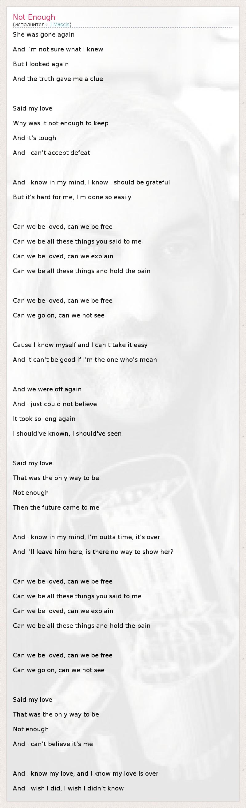 She was gone again And I'm not sure what I knew But I looked again And the truth gave me a clue Said my love Why was it not enough to keep And it's tough And I can't accept defeat And I know in my mind, I know I should be grateful But it's hard for me, I'm done so easily Can we be loved, can we be free Can we be all these things you said to me Can we be loved, can we explain Can we be all these things and hold the pain Can we be loved, can we be free Can we go on, can we not see Cause I know myself and I can't take it easy And it can't be good if I'm the one who's mean And we were off again And I just could not believe It took so long again I should've known, I should've seen Said my love That was the only way to be Not enough Then the future came to me And I know in my mind, I'm outta time, it's over And I'll leave him here, is there no way to show her? Can we be loved, can we be free Can we be all these things you said to me Can we be loved, can we explain Can we be all these things and hold the pain Can we be loved, can we be free Can we go on, can we not see Said my love That was the only way to be Not enough And I can't believe it's me And I know my love, and I know my love is over And I wish I did, I wish I didn't know