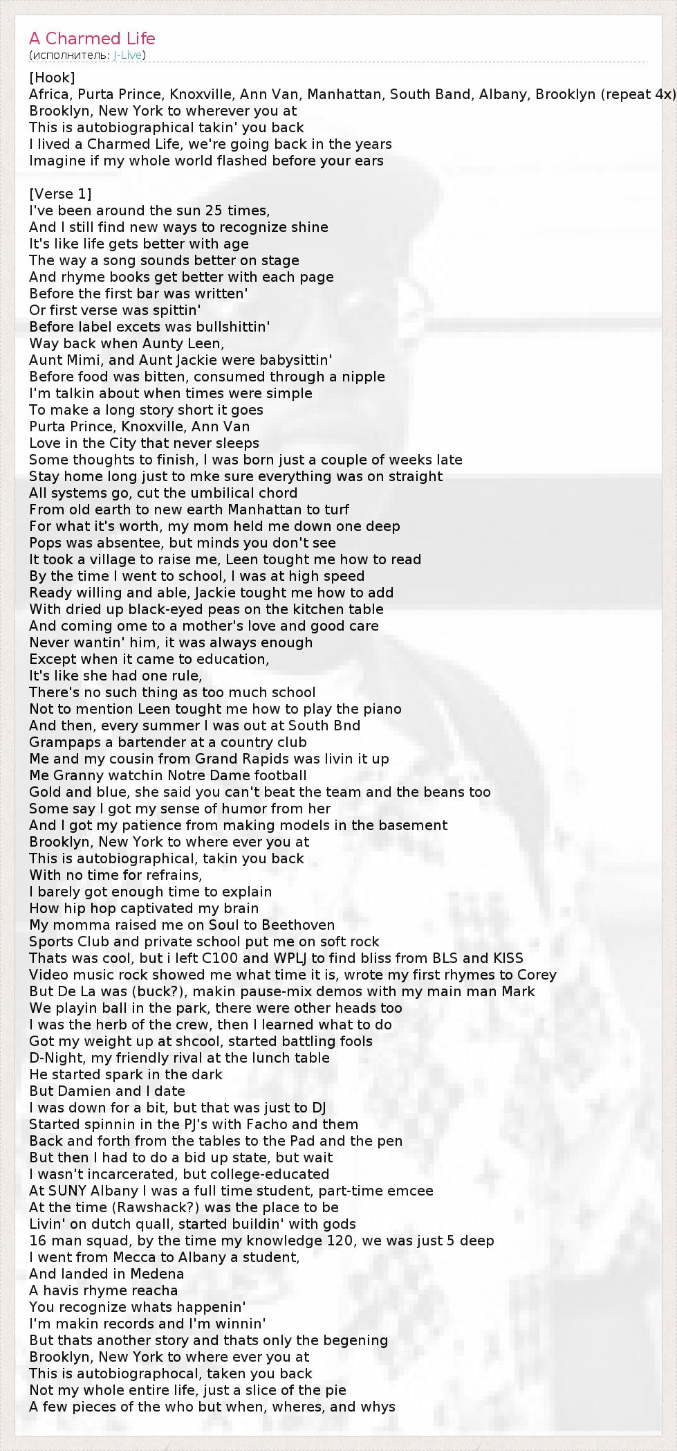 [Hook] Africa, Purta Prince, Knoxville, Ann Van, Manhattan, South Band, Albany, Brooklyn (repeat 4x) Brooklyn, New York to wherever you at This is autobiographical takin' you back I lived a Charmed Life, we're going back in the years Imagine if my whole world flashed before your ears [Verse 1] I've been around the sun 25 times, And I still find new ways to recognize shine It's like life gets better with age The way a song sounds better on stage And rhyme books get better with each page Before the first bar was written' Or first verse was spittin' Before label excets was bullshittin' Way back when Aunty Leen, Aunt Mimi, and Aunt Jackie were babysittin' Before food was bitten, consumed through a nipple I'm talkin about when times were simple To make a long story short it goes Purta Prince, Knoxville, Ann Van Love in the City that never sleeps Some thoughts to finish, I was born just a couple of weeks late Stay home long just to mke sure everything was on straight All systems go, cut the umbilical chord From old earth to new earth Manhattan to turf For what it's worth, my mom held me down one deep Pops was absentee, but minds you don't see It took a village to raise me, Leen tought me how to read By the time I went to school, I was at high speed Ready willing and able, Jackie tought me how to add With dried up black-eyed peas on the kitchen table And coming ome to a mother's love and good care Never wantin' him, it was always enough Except when it came to education, It's like she had one rule, There's no such thing as too much school Not to mention Leen tought me how to play the piano And then, every summer I was out at South Bnd Grampaps a bartender at a country club Me and my cousin from Grand Rapids was livin it up Me Granny watchin Notre Dame football Gold and blue, she said you can't beat the team and the beans too Some say I got my sense of humor from her And I got my patience from making models in the basement Brooklyn, New York to where ever you at This is autobiographical, takin you back With no time for refrains, I barely got enough time to explain How hip hop captivated my brain My momma raised me on Soul to Beethoven Sports Club and private school put me on soft rock Thats was cool, but i left C100 and WPLJ to find bliss from BLS and KISS Video music rock showed me what time it is, wrote my first rhymes to Corey But De La was (buck?), makin pause-mix demos with my main man Mark We playin ball in the park, there were other heads too I was the herb of the crew, then I learned what to do Got my weight up at shcool, started battling fools D-Night, my friendly rival at the lunch table He started spark in the dark But Damien and I date I was down for a bit, but that was just to DJ Started spinnin in the PJ's with Facho and them Back and forth from the tables to the Pad and the pen But then I had to do a bid up state, but wait I wasn't incarcerated, but college-educated At SUNY Albany I was a full time student, part-time emcee At the time (Rawshack?) was the place to be Livin' on dutch quall, started buildin' with gods 16 man squad, by the time my knowledge 120, we was just 5 deep I went from Mecca to Albany a student, And landed in Medena A havis rhyme reacha You recognize whats happenin' I'm makin records and I'm winnin' But thats another story and thats only the begening Brooklyn, New York to where ever you at This is autobiographocal, taken you back Not my whole entire life, just a slice of the pie A few pieces of the who but when, wheres, and whys