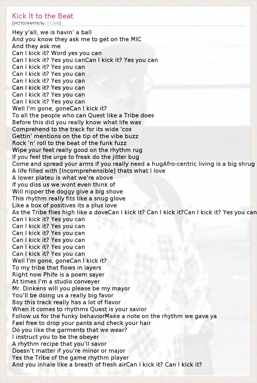 Hey y'all, we is havin' a ball And you know they ask me to get on the MIC And they ask me Can I kick it? Word yes you can Can I kick it? Yes you canCan I kick it? Yes you can Can I kick it? Yes you can Can I kick it? Yes you can Can I kick it? Yes you can Can I kick it? Yes you can Can I kick it? Yes you can Can I kick it? Yes you can Well I'm gone, goneCan I kick it? To all the people who can Quest like a Tribe does Before this did you really know what life was Comprehend to the track for its wide 'cos Gettin' mentions on the tip of the vibe buzz Rock 'n' roll to the beat of the funk fuzz Wipe your feet really good on the rhythm rug If you feel the urge to freak do the jitter bug Come and spread your arms if you really need a hugAfro-centric living is a big shrug A life filled with [Incomprehensible] thats what I love A lower plateu is what we're above If you diss us we wont even think of Will nipper the doggy give a big shove This rhythm really fits like a snug glove Like a box of positives its a plus love As the Tribe flies high like a doveCan I kick it? Can I kick it?Can I kick it? Yes you can Can I kick it? Yes you can Can I kick it? Yes you can Can I kick it? Yes you can Can I kick it? Yes you can Can I kick it? Yes you can Can I kick it? Yes you can Well I'm gone, goneCan I kick it? To my tribe that flows in layers Right now Phife is a poem sayer At times I'm a studio conveyer Mr. Dinkens will you please be my mayor You'll be doing us a really big favor Boy this track really has a lot of flavor When it comes to rhythms Quest is your savior Follow us for the funky behaviorMake a note on the rhythm we gave ya Feel free to drop your pants and check your hair Do you like the garments that we wear? I instruct you to be the obeyer A rhythm recipe that you'll savor Doesn't matter if you're minor or major Yes the Tribe of the game rhythm player And you inhale like a breath of fresh airCan I kick it? Can I kick it?