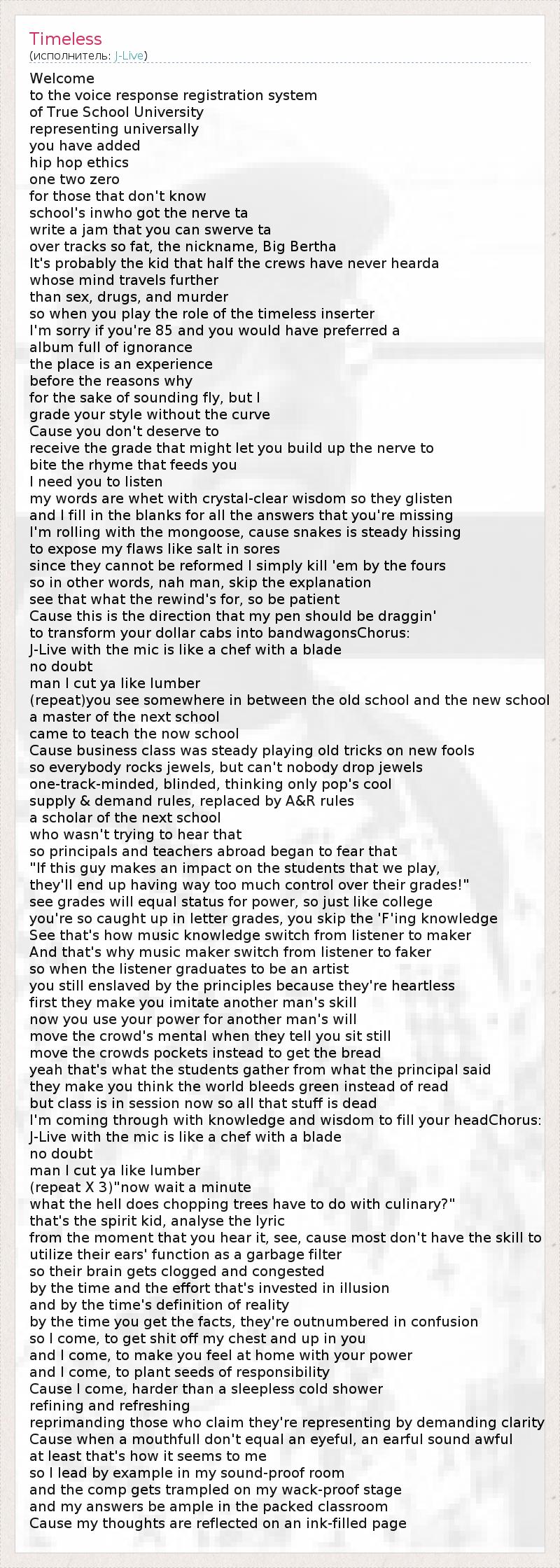 Welcome to the voice response registration system of True School University representing universally you have added hip hop ethics one two zero for those that don't know school's inwho got the nerve ta write a jam that you can swerve ta over tracks so fat, the nickname, Big Bertha It's probably the kid that half the crews have never hearda whose mind travels further than sex, drugs, and murder so when you play the role of the timeless inserter I'm sorry if you're 85 and you would have preferred a album full of ignorance the place is an experience before the reasons why for the sake of sounding fly, but I grade your style without the curve Cause you don't deserve to receive the grade that might let you build up the nerve to bite the rhyme that feeds you I need you to listen my words are whet with crystal-clear wisdom so they glisten and I fill in the blanks for all the answers that you're missing I'm rolling with the mongoose, cause snakes is steady hissing to expose my flaws like salt in sores since they cannot be reformed I simply kill 'em by the fours so in other words, nah man, skip the explanation see that what the rewind's for, so be patient Cause this is the direction that my pen should be draggin' to transform your dollar cabs into bandwagonsChorus: J-Live with the mic is like a chef with a blade no doubt man I cut ya like lumber (repeat)you see somewhere in between the old school and the new school a master of the next school came to teach the now school Cause business class was steady playing old tricks on new fools so everybody rocks jewels, but can't nobody drop jewels one-track-minded, blinded, thinking only pop's cool supply & demand rules, replaced by A&R rules a scholar of the next school who wasn't trying to hear that so principals and teachers abroad began to fear that "If this guy makes an impact on the students that we play, they'll end up having way too much control over their grades!" see grades will equal status for power, so just like college you're so caught up in letter grades, you skip the 'F'ing knowledge See that's how music knowledge switch from listener to maker And that's why music maker switch from listener to faker so when the listener graduates to be an artist you still enslaved by the principles because they're heartless first they make you imitate another man's skill now you use your power for another man's will move the crowd's mental when they tell you sit still move the crowds pockets instead to get the bread yeah that's what the students gather from what the principal said they make you think the world bleeds green instead of read but class is in session now so all that stuff is dead I'm coming through with knowledge and wisdom to fill your headChorus: J-Live with the mic is like a chef with a blade no doubt man I cut ya like lumber (repeat X 3)"now wait a minute what the hell does chopping trees have to do with culinary?" that's the spirit kid, analyse the lyric from the moment that you hear it, see, cause most don't have the skill to utilize their ears' function as a garbage filter so their brain gets clogged and congested by the time and the effort that's invested in illusion and by the time's definition of reality by the time you get the facts, they're outnumbered in confusion so I come, to get shit off my chest and up in you and I come, to make you feel at home with your power and I come, to plant seeds of responsibility Cause I come, harder than a sleepless cold shower refining and refreshing reprimanding those who claim they're representing by demanding clarity Cause when a mouthfull don't equal an eyeful, an earful sound awful at least that's how it seems to me so I lead by example in my sound-proof room and the comp gets trampled on my wack-proof stage and my answers be ample in the packed classroom Cause my thoughts are reflected on an ink-filled page