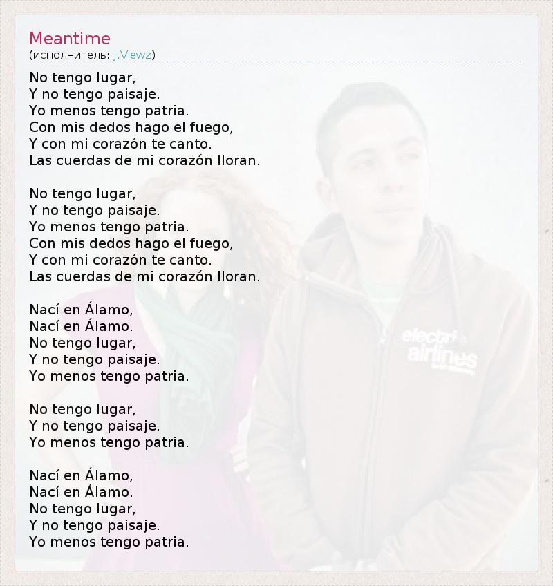 No tengo lugar, Y no tengo paisaje. Yo menos tengo patria. Con mis dedos hago el fuego, Y con mi corazón te canto. Las cuerdas de mi corazón lloran. No tengo lugar, Y no tengo paisaje. Yo menos tengo patria. Con mis dedos hago el fuego, Y con mi corazón te canto. Las cuerdas de mi corazón lloran. Nací en Álamo, Nací en Álamo. No tengo lugar, Y no tengo paisaje. Yo menos tengo patria. No tengo lugar, Y no tengo paisaje. Yo menos tengo patria. Nací en Álamo, Nací en Álamo. No tengo lugar, Y no tengo paisaje. Yo menos tengo patria.