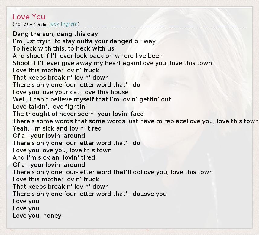Dang the sun, dang this day I'm just tryin' to stay outta your danged ol' way To heck with this, to heck with us And shoot if I'll ever look back on where I've been Shoot if I'll ever give away my heart againLove you, love this town Love this mother lovin' truck That keeps breakin' lovin' down There's only one four letter word that'll do Love youLove your cat, love this house Well, I can't believe myself that I'm lovin' gettin' out Love talkin', love fightin' The thought of never seein' your lovin' face There's some words that some words just have to replaceLove you, love this town Yeah, I'm sick and lovin' tired Of all your lovin' around There's only one four letter word that'll do Love youLove you, love this town And I'm sick an' lovin' tired Of all your lovin' around There's only one four-letter word that'll doLove you, love this town Love this mother lovin' truck That keeps breakin' lovin' down There's only one four letter word that'll doLove you Love you Love you Love you, honey