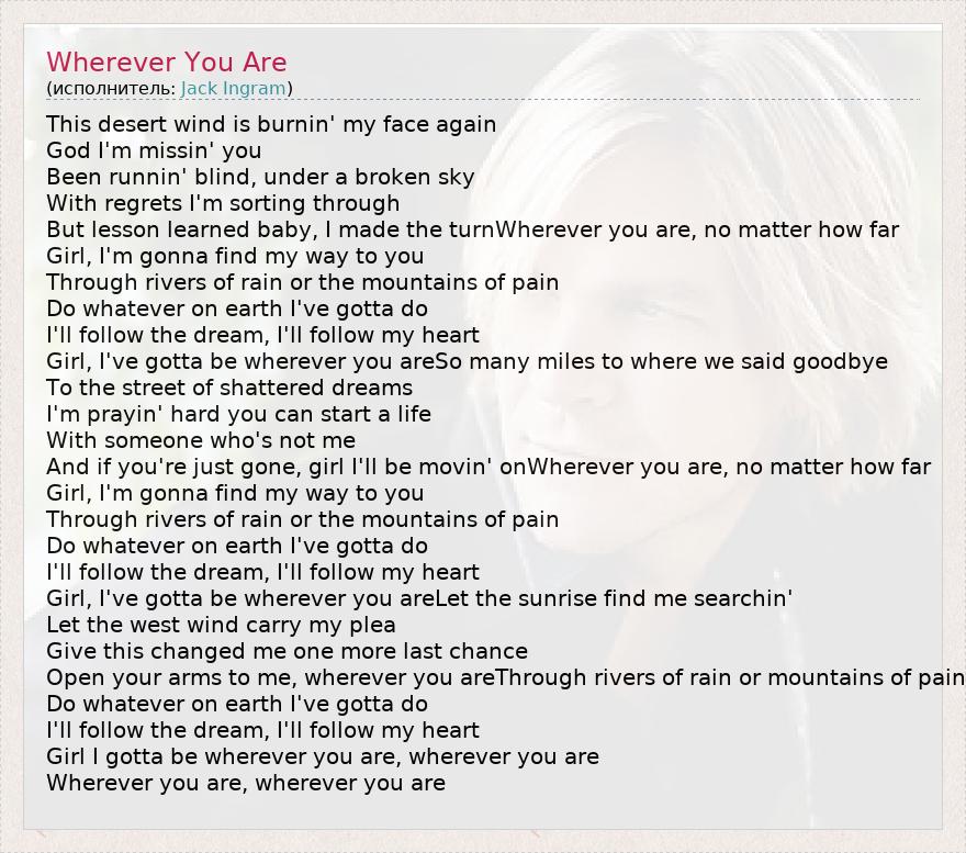 This desert wind is burnin' my face again God I'm missin' you Been runnin' blind, under a broken sky With regrets I'm sorting through But lesson learned baby, I made the turnWherever you are, no matter how far Girl, I'm gonna find my way to you Through rivers of rain or the mountains of pain Do whatever on earth I've gotta do I'll follow the dream, I'll follow my heart Girl, I've gotta be wherever you areSo many miles to where we said goodbye To the street of shattered dreams I'm prayin' hard you can start a life With someone who's not me And if you're just gone, girl I'll be movin' onWherever you are, no matter how far Girl, I'm gonna find my way to you Through rivers of rain or the mountains of pain Do whatever on earth I've gotta do I'll follow the dream, I'll follow my heart Girl, I've gotta be wherever you areLet the sunrise find me searchin' Let the west wind carry my plea Give this changed me one more last chance Open your arms to me, wherever you areThrough rivers of rain or mountains of pain Do whatever on earth I've gotta do I'll follow the dream, I'll follow my heart Girl I gotta be wherever you are, wherever you are Wherever you are, wherever you are