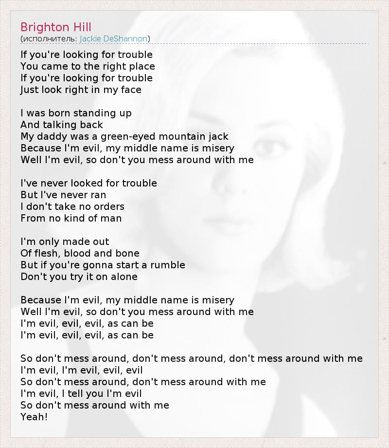 If you're looking for trouble You came to the right place If you're looking for trouble Just look right in my face I was born standing up And talking back My daddy was a green-eyed mountain jack Because I'm evil, my middle name is misery Well I'm evil, so don't you mess around with me I've never looked for trouble But I've never ran I don't take no orders From no kind of man I'm only made out Of flesh, blood and bone But if you're gonna start a rumble Don't you try it on alone Because I'm evil, my middle name is misery Well I'm evil, so don't you mess around with me I'm evil, evil, evil, as can be I'm evil, evil, evil, as can be So don't mess around, don't mess around, don't mess around with me I'm evil, I'm evil, evil, evil So don't mess around, don't mess around with me I'm evil, I tell you I'm evil So don't mess around with me Yeah!