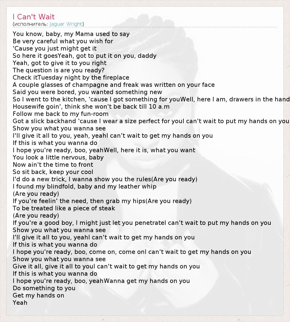You know, baby, my Mama used to say Be very careful what you wish for 'Cause you just might get it So here it goesYeah, got to put it on you, daddy Yeah, got to give it to you right The question is are you ready? Check itTuesday night by the fireplace A couple glasses of champagne and freak was written on your face Said you were bored, you wanted something new So I went to the kitchen, 'cause I got something for youWell, here I am, drawers in the hand Housewife goin', think she won't be back till 10 a.m Follow me back to my fun-room Got a slick backhand 'cause I wear a size perfect for youI can't wait to put my hands on you Show you what you wanna see I'll give it all to you, yeah, yeahI can't wait to get my hands on you If this is what you wanna do I hope you're ready, boo, yeahWell, here it is, what you want You look a little nervous, baby Now ain't the time to front So sit back, keep your cool I'd do a new trick, I wanna show you the rules(Are you ready) I found my blindfold, baby and my leather whip (Are you ready) If you're feelin' the need, then grab my hips(Are you ready) To be treated like a piece of steak (Are you ready) If you're a good boy, I might just let you penetrateI can't wait to put my hands on you Show you what you wanna see I'll give it all to you, yeahI can't wait to get my hands on you If this is what you wanna do I hope you're ready, boo, come on, come onI can't wait to get my hands on you Show you what you wanna see Give it all, give it all to youI can't wait to get my hands on you If this is what you wanna do I hope you're ready, boo, yeahWanna get my hands on you Do something to you Get my hands on Yeah