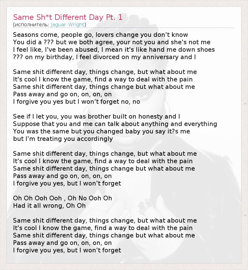 Seasons come, people go, lovers change you don't know You did a ??? but we both agree, your not you and she's not me I feel like, I've been abused, I mean it's like hand me down shoes ??? on my birthday, I feel divorced on my anniversary and I Same shit different day, things change, but what about me It's cool I know the game, find a way to deal with the pain Same shit different day, things change but what about me Pass away and go on, on, on, on I forgive you yes but I won't forget no, no See if I let you, you was brother built on honesty and I Suppose that you and me can talk about anything and everything You was the same but you changed baby you say it?s me but I'm treating you accordingly Same shit different day, things change, but what about me It's cool I know the game, find a way to deal with the pain Same shit different day, things change but what about me Pass away and go on, on, on, on I forgive you yes, but I won't forget Oh Oh Ooh Ooh , Oh No Ooh Oh Had it all wrong, Oh Oh Same shit different day, things change, but what about me It's cool I know the game, find a way to deal with the pain Same shit different day, things change but what about me Pass away and go on, on, on, on I forgive you yes, but I won't forget