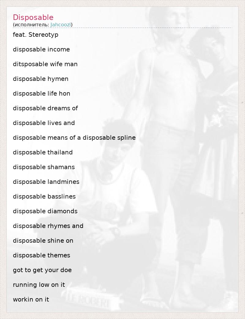 feat. Stereotyp disposable income ditsposable wife man disposable hymen disposable life hon disposable dreams of disposable lives and disposable means of a disposable spline disposable thailand disposable shamans disposable landmines disposable basslines disposable diamonds disposable rhymes and disposable shine on disposable themes got to get your doe running low on it workin on it