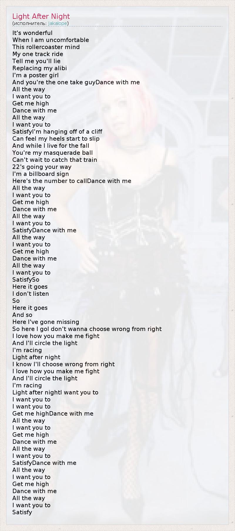 It's wonderful When I am uncomfortable This rollercoaster mind My one track ride Tell me you'll lie Replacing my alibi I'm a poster girl And you're the one take guyDance with me All the way I want you to Get me high Dance with me All the way I want you to SatisfyI'm hanging off of a cliff Can feel my heels start to slip And while I live for the fall You're my masquerade ball Can't wait to catch that train 22's going your way I'm a billboard sign Here's the number to callDance with me All the way I want you to Get me high Dance with me All the way I want you to SatisfyDance with me All the way I want you to Get me high Dance with me All the way I want you to SatisfySo Here it goes I don't listen So Here it goes And so Here I've gone missing So here I goI don't wanna choose wrong from right I love how you make me fight And I'll circle the light I'm racing Light after night I know I'll choose wrong from right I love how you make me fight And I'll circle the light I'm racing Light after nightI want you to I want you to I want you to Get me highDance with me All the way I want you to Get me high Dance with me All the way I want you to SatisfyDance with me All the way I want you to Get me high Dance with me All the way I want you to Satisfy