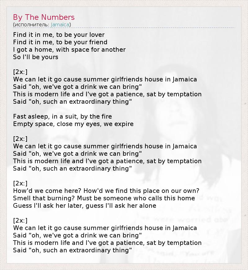 Find it in me, to be your lover Find it in me, to be your friend I got a home, with space for another So I'll be yours [2x:] We can let it go cause summer girlfriends house in Jamaica Said "oh, we've got a drink we can bring" This is modern life and I've got a patience, sat by temptation Said "oh, such an extraordinary thing" Fast asleep, in a suit, by the fire Empty space, close my eyes, we expire [2x:] We can let it go cause summer girlfriends house in Jamaica Said "oh, we've got a drink we can bring" This is modern life and I've got a patience, sat by temptation Said "oh, such an extraordinary thing" [2x:] How'd we come here? How'd we find this place on our own? Smell that burning? Must be someone who calls this home Guess I'll ask her later, guess I'll ask her alone [2x:] We can let it go cause summer girlfriends house in Jamaica Said "oh, we've got a drink we can bring" This is modern life and I've got a patience, sat by temptation Said "oh, such an extraordinary thing"