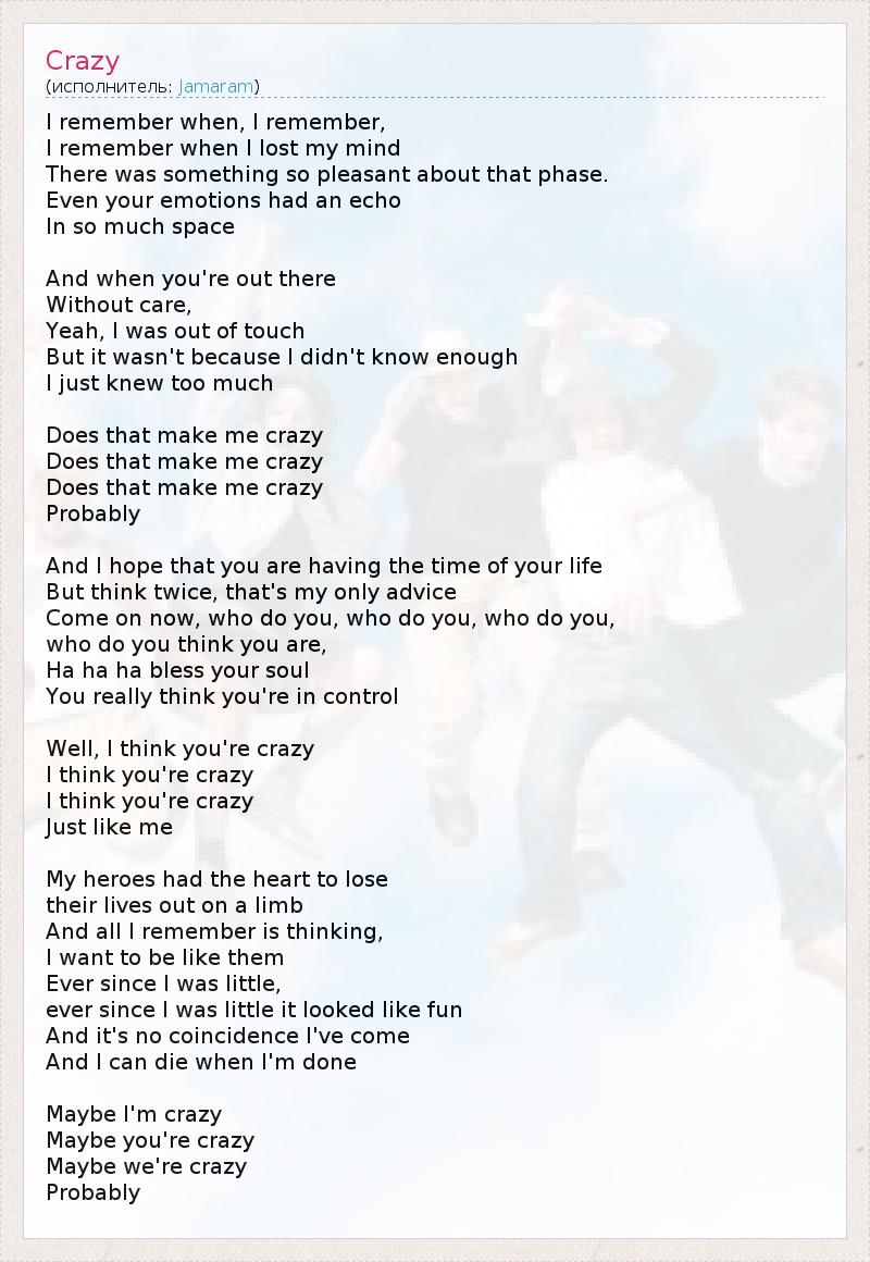 Я помню, когда… Я помню… Я помню, когда я сошёл с ума, В этом состоянии было даже что-то приятное. Даже твои эмоции отражались эхом В безграничном пространстве. Когда ты где-то там, Далеко от забот… Да, я не имел представления ни о чём, Но не потому, что я ничего не знал, А совсем наоборот, я знал слишком много… Разве это делает меня сумасшедшим? Разве это делает меня сумасшедшим? Разве это делает меня сумасшедшим? Возможно… Надеюсь, ты наслаждаешься жизнью. Но, мой совет тебе, не принимай скоропалительных решений. Ты, кого ты, кого ты, Кого ты из себя возомнил? Ха-ха-ха, Господь с тобой, Ты, правда, думаешь, что ты в своём уме! А я думаю, что ты сумасшедший. Я думаю, что ты сумасшедший. Я думаю, что ты сумасшедший, Совсем как я. Моим героям хватало смелости Рисковать жизнью и умирать. И я помню лишь то, Как хотел быть похожим на них. Впоследствии всю жизнь… Впоследствии всю жизнь мне казалось это забавным. Нет ничего случайного в том, что я пришёл в этот мир. И я умру, когда выполню своё предназначение. Возможно, я сумасшедший, Возможно, ты сумасшедший, Возможно, мы сумасшедшие… Возможно…