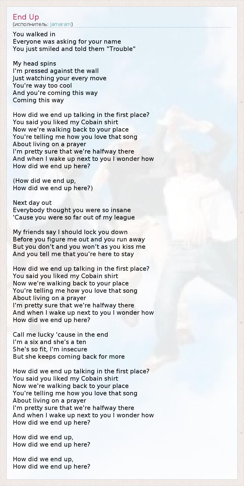 You walked in Everyone was asking for your name You just smiled and told them "Trouble" My head spins I'm pressed against the wall Just watching your every move You're way too cool And you're coming this way Coming this way How did we end up talking in the first place? You said you liked my Cobain shirt Now we're walking back to your place You're telling me how you love that song About living on a prayer I'm pretty sure that we're halfway there And when I wake up next to you I wonder how How did we end up here? (How did we end up, How did we end up here?) Next day out Everybody thought you were so insane 'Cause you were so far out of my league My friends say I should lock you down Before you figure me out and you run away But you don't and you won't as you kiss me And you tell me that you're here to stay How did we end up talking in the first place? You said you liked my Cobain shirt Now we're walking back to your place You're telling me how you love that song About living on a prayer I'm pretty sure that we're halfway there And when I wake up next to you I wonder how How did we end up here? Call me lucky 'cause in the end I'm a six and she's a ten She's so fit, I'm insecure But she keeps coming back for more How did we end up talking in the first place? You said you liked my Cobain shirt Now we're walking back to your place You're telling me how you love that song About living on a prayer I'm pretty sure that we're halfway there And when I wake up next to you I wonder how How did we end up here? How did we end up, How did we end up here? How did we end up, How did we end up here?