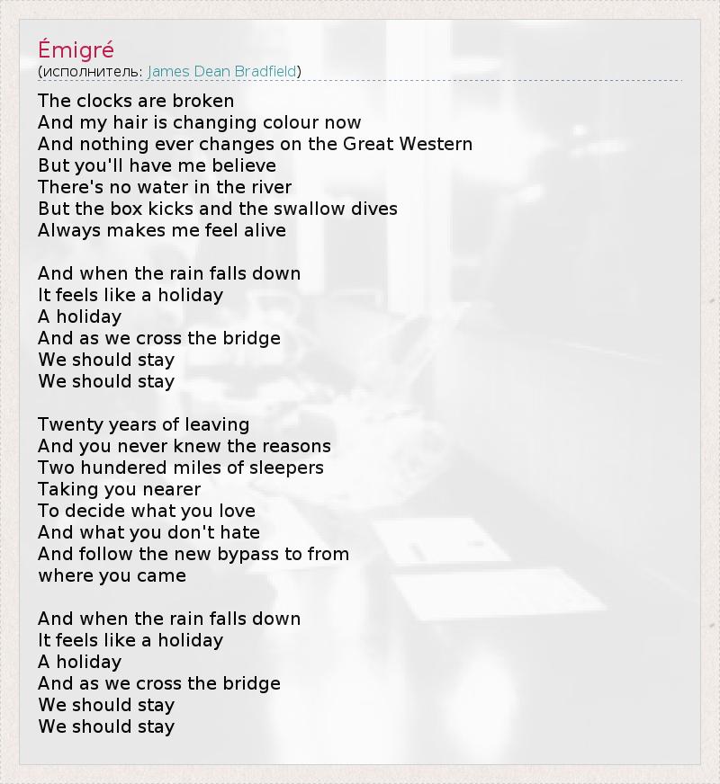 Это интересно:Джеймс Дин Брэдфилд (англ. James Dean Bradfield; род. 21 февраля 1969) — лидер (гитара, вокал) валлийской рок-группы Manic Street Preachers. Сольный альбом «The Great Western» вышел 24 июля 2006 года.James Dean Bradfield (Джэймс Дин Брэдфилд) - вокалист и выдающийся гитарист одной из популярнейших рок-групп Великобритании MANIC STREET PREACHERS (группа родом из г. Блэквуд, Уэльс). В 2006 году артист выпустил единственный на сегодняшний день... продолжение