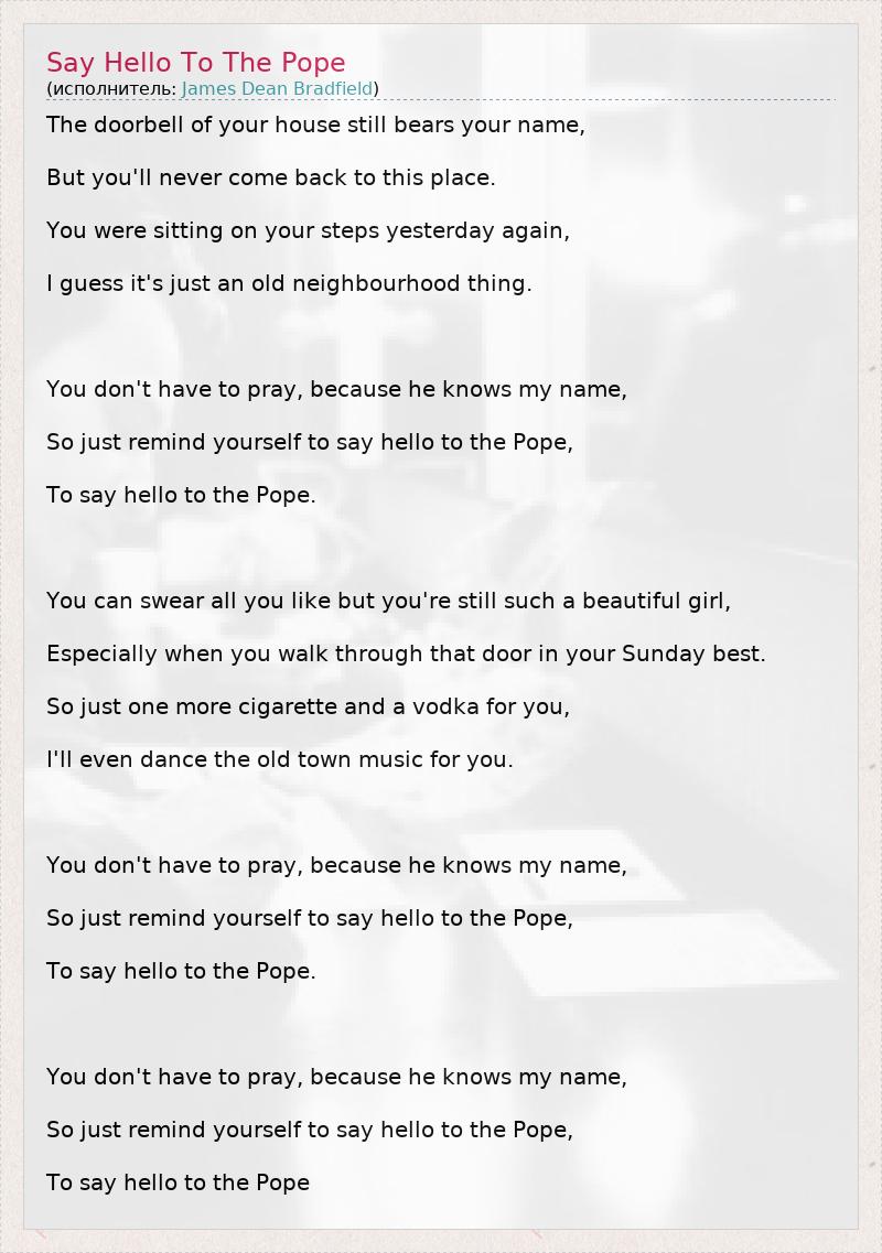 The doorbell of your house still bears your name, But you'll never come back to this place. You were sitting on your steps yesterday again, I guess it's just an old neighbourhood thing. You don't have to pray, because he knows my name, So just remind yourself to say hello to the Pope, To say hello to the Pope. You can swear all you like but you're still such a beautiful girl, Especially when you walk through that door in your Sunday best. So just one more cigarette and a vodka for you, I'll even dance the old town music for you. You don't have to pray, because he knows my name, So just remind yourself to say hello to the Pope, To say hello to the Pope. You don't have to pray, because he knows my name, So just remind yourself to say hello to the Pope, To say hello to the Pope