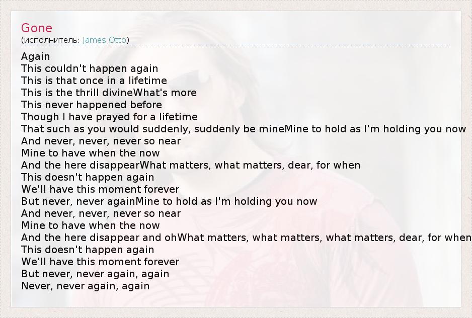 Again This couldn't happen again This is that once in a lifetime This is the thrill divineWhat's more This never happened before Though I have prayed for a lifetime That such as you would suddenly, suddenly be mineMine to hold as I'm holding you now And never, never, never so near Mine to have when the now And the here disappearWhat matters, what matters, dear, for when This doesn't happen again We'll have this moment forever But never, never againMine to hold as I'm holding you now And never, never, never so near Mine to have when the now And the here disappear and ohWhat matters, what matters, what matters, dear, for when This doesn't happen again We'll have this moment forever But never, never again, again Never, never again, again