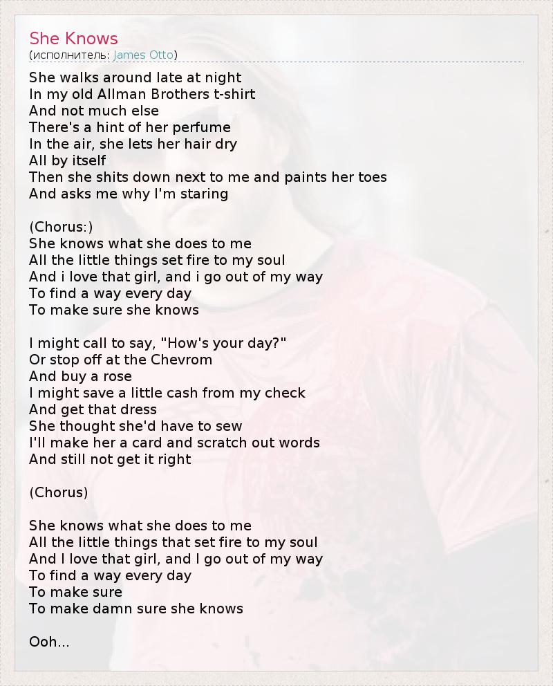 She walks around late at night In my old Allman Brothers t-shirt And not much else There's a hint of her perfume In the air, she lets her hair dry All by itself Then she shits down next to me and paints her toes And asks me why I'm staring (Chorus:) She knows what she does to me All the little things set fire to my soul And i love that girl, and i go out of my way To find a way every day To make sure she knows I might call to say, "How's your day?" Or stop off at the Chevrom And buy a rose I might save a little cash from my check And get that dress She thought she'd have to sew I'll make her a card and scratch out words And still not get it right (Chorus) She knows what she does to me All the little things that set fire to my soul And I love that girl, and I go out of my way To find a way every day To make sure To make damn sure she knows Ooh...