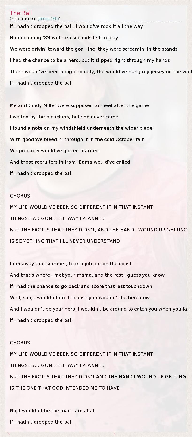 If I hadn't dropped the ball, I would've took it all the way Homecoming '89 with ten seconds left to play We were drivin' toward the goal line, they were screamin' in the stands I had the chance to be a hero, but it slipped right through my hands There would've been a big pep rally, the would've hung my jersey on the wall If I hadn't dropped the ball Me and Cindy Miller were supposed to meet after the game I waited by the bleachers, but she never came I found a note on my windshield underneath the wiper blade With goodbye bleedin' through it in the cold October rain We probably would've gotten married And those recruiters in from 'Bama would've called If I hadn't dropped the ball CHORUS: MY LIFE WOULD'VE BEEN SO DIFFERENT IF IN THAT INSTANT THINGS HAD GONE THE WAY I PLANNED BUT THE FACT IS THAT THEY DIDN'T, AND THE HAND I WOUND UP GETTING IS SOMETHING THAT I'LL NEVER UNDERSTAND I ran away that summer, took a job out on the coast And that's where I met your mama, and the rest I guess you know If I had the chance to go back and score that last touchdown Well, son, I wouldn't do it, 'cause you wouldn't be here now And I wouldn't be your hero, I wouldn't be around to catch you when you fall If I hadn't dropped the ball CHORUS: MY LIFE WOULD'VE BEEN SO DIFFERENT IF IN THAT INSTANT THINGS HAD GONE THE WAY I PLANNED BUT THE FACT IS THAT THEY DIDN'T AND THE HAND I WOUND UP GETTING IS THE ONE THAT GOD INTENDED ME TO HAVE No, I wouldn't be the man I am at all If I hadn't dropped the ball