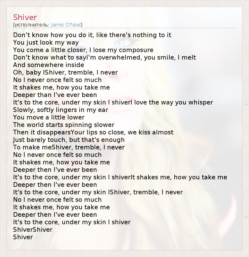 Don't know how you do it, like there's nothing to it You just look my way You come a little closer, I lose my composure Don't know what to sayI'm overwhelmed, you smile, I melt And somewhere inside Oh, baby IShiver, tremble, I never No I never once felt so much It shakes me, how you take me Deeper than I've ever been It's to the core, under my skin I shiverI love the way you whisper Slowly, softly lingers in my ear You move a little lower The world starts spinning slower Then it disappearsYour lips so close, we kiss almost Just barely touch, but that's enough To make meShiver, tremble, I never No I never once felt so much It shakes me, how you take me Deeper then I've ever been It's to the core, under my skin I shiverIt shakes me, how you take me Deeper then I've ever been It's to the core, under my skin IShiver, tremble, I never No I never once felt so much It shakes me, how you take me Deeper then I've ever been It's to the core, under my skin I shiver ShiverShiver Shiver