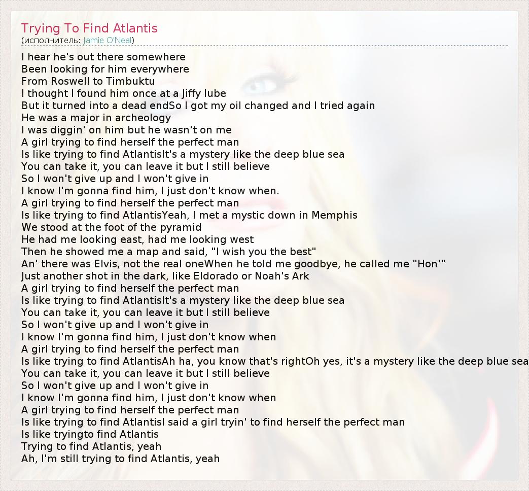 I hear he's out there somewhere Been looking for him everywhere From Roswell to Timbuktu I thought I found him once at a Jiffy lube But it turned into a dead endSo I got my oil changed and I tried again He was a major in archeology I was diggin' on him but he wasn't on me A girl trying to find herself the perfect man Is like trying to find AtlantisIt's a mystery like the deep blue sea You can take it, you can leave it but I still believe So I won't give up and I won't give in I know I'm gonna find him, I just don't know when. A girl trying to find herself the perfect man Is like trying to find AtlantisYeah, I met a mystic down in Memphis We stood at the foot of the pyramid He had me looking east, had me looking west Then he showed me a map and said, "I wish you the best" An' there was Elvis, not the real oneWhen he told me goodbye, he called me "Hon'" Just another shot in the dark, like Eldorado or Noah's Ark A girl trying to find herself the perfect man Is like trying to find AtlantisIt's a mystery like the deep blue sea You can take it, you can leave it but I still believe So I won't give up and I won't give in I know I'm gonna find him, I just don't know when A girl trying to find herself the perfect man Is like trying to find AtlantisAh ha, you know that's rightOh yes, it's a mystery like the deep blue sea You can take it, you can leave it but I still believe So I won't give up and I won't give in I know I'm gonna find him, I just don't know when A girl trying to find herself the perfect man Is like trying to find AtlantisI said a girl tryin' to find herself the perfect man Is like tryingto find Atlantis Trying to find Atlantis, yeah Ah, I'm still trying to find Atlantis, yeah