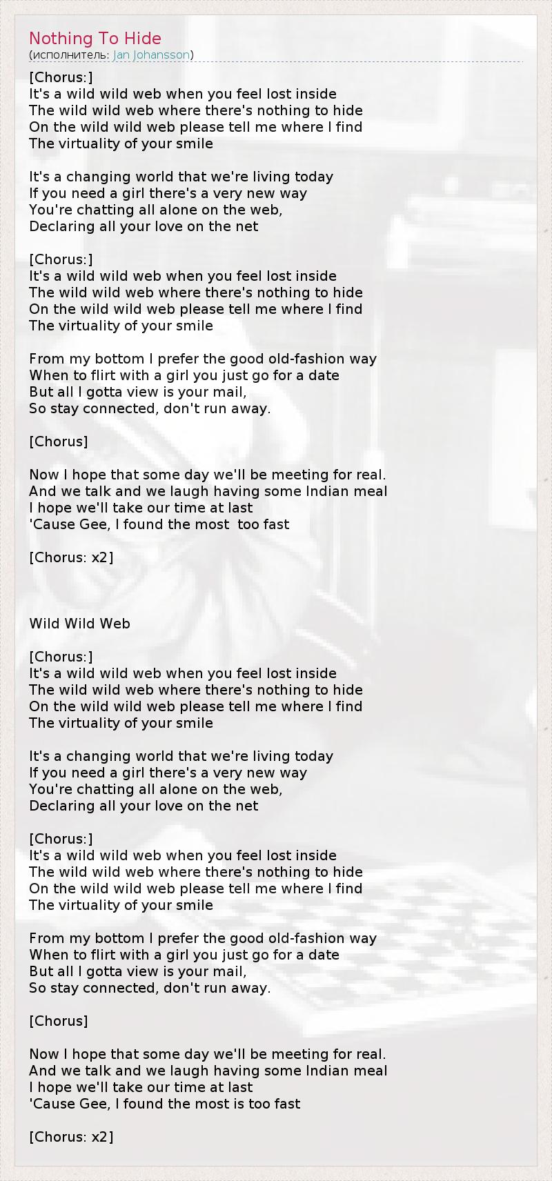 [Chorus:] It's a wild wild web when you feel lost inside The wild wild web where there's nothing to hide On the wild wild web please tell me where I find The virtuality of your smile It's a changing world that we're living today If you need a girl there's a very new way You're chatting all alone on the web, Declaring all your love on the net [Chorus:] It's a wild wild web when you feel lost inside The wild wild web where there's nothing to hide On the wild wild web please tell me where I find The virtuality of your smile From my bottom I prefer the good old-fashion way When to flirt with a girl you just go for a date But all I gotta view is your mail, So stay connected, don't run away. [Chorus] Now I hope that some day we'll be meeting for real. And we talk and we laugh having some Indian meal I hope we'll take our time at last 'Cause Gee, I found the most too fast [Chorus: x2] Wild Wild Web [Chorus:] It's a wild wild web when you feel lost inside The wild wild web where there's nothing to hide On the wild wild web please tell me where I find The virtuality of your smile It's a changing world that we're living today If you need a girl there's a very new way You're chatting all alone on the web, Declaring all your love on the net [Chorus:] It's a wild wild web when you feel lost inside The wild wild web where there's nothing to hide On the wild wild web please tell me where I find The virtuality of your smile From my bottom I prefer the good old-fashion way When to flirt with a girl you just go for a date But all I gotta view is your mail, So stay connected, don't run away. [Chorus] Now I hope that some day we'll be meeting for real. And we talk and we laugh having some Indian meal I hope we'll take our time at last 'Cause Gee, I found the most is too fast [Chorus: x2]