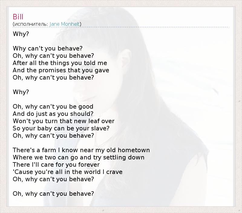 Why? Why can't you behave? Oh, why can't you behave? After all the things you told me And the promises that you gave Oh, why can't you behave? Why? Oh, why can't you be good And do just as you should? Won't you turn that new leaf over So your baby can be your slave? Oh, why can't you behave? There's a farm I know near my old hometown Where we two can go and try settling down There I'll care for you forever 'Cause you're all in the world I crave Oh, why can't you behave? Oh, why can't you behave?