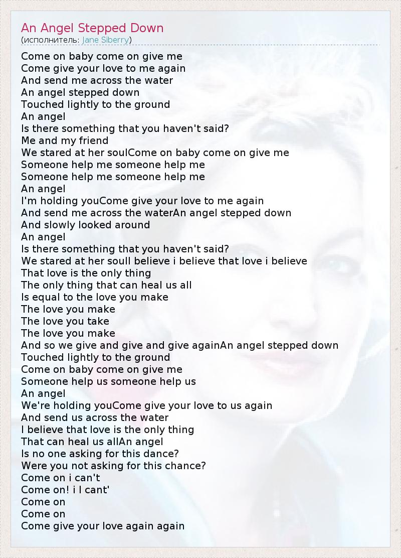 Come on baby come on give me Come give your love to me again And send me across the water An angel stepped down Touched lightly to the ground An angel Is there something that you haven't said? Me and my friend We stared at her soulCome on baby come on give me Someone help me someone help me Someone help me someone help me An angel I'm holding youCome give your love to me again And send me across the waterAn angel stepped down And slowly looked around An angel Is there something that you haven't said? We stared at her soulI believe i believe that love i believe That love is the only thing The only thing that can heal us all Is equal to the love you make The love you make The love you take The love you make And so we give and give and give againAn angel stepped down Touched lightly to the ground Come on baby come on give me Someone help us someone help us An angel We're holding youCome give your love to us again And send us across the water I believe that love is the only thing That can heal us allAn angel Is no one asking for this dance? Were you not asking for this chance? Come on i can't Come on! i I cant' Come on Come on Come give your love again again