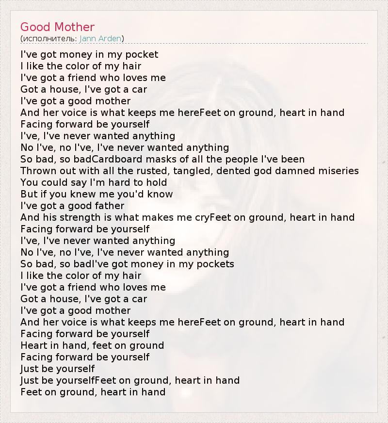 I've got money in my pocket I like the color of my hair I've got a friend who loves me Got a house, I've got a car I've got a good mother And her voice is what keeps me hereFeet on ground, heart in hand Facing forward be yourself I've, I've never wanted anything No I've, no I've, I've never wanted anything So bad, so badCardboard masks of all the people I've been Thrown out with all the rusted, tangled, dented god damned miseries You could say I'm hard to hold But if you knew me you'd know I've got a good father And his strength is what makes me cryFeet on ground, heart in hand Facing forward be yourself I've, I've never wanted anything No I've, no I've, I've never wanted anything So bad, so badI've got money in my pockets I like the color of my hair I've got a friend who loves me Got a house, I've got a car I've got a good mother And her voice is what keeps me hereFeet on ground, heart in hand Facing forward be yourself Heart in hand, feet on ground Facing forward be yourself Just be yourself Just be yourselfFeet on ground, heart in hand Feet on ground, heart in hand