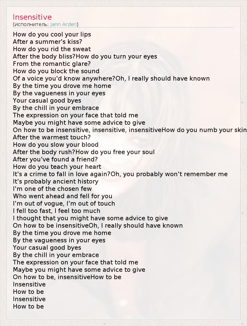 How do you cool your lips After a summer's kiss? How do you rid the sweat After the body bliss?How do you turn your eyes From the romantic glare? How do you block the sound Of a voice you'd know anywhere?Oh, I really should have known By the time you drove me home By the vagueness in your eyes Your casual good byes By the chill in your embrace The expression on your face that told me Maybe you might have some advice to give On how to be insensitive, insensitive, insensitiveHow do you numb your skin After the warmest touch? How do you slow your blood After the body rush?How do you free your soul After you've found a friend? How do you teach your heart It's a crime to fall in love again?Oh, you probably won't remember me It's probably ancient history I'm one of the chosen few Who went ahead and fell for you I'm out of vogue, I'm out of touch I fell too fast, I feel too much I thought that you might have some advice to give On how to be insensitiveOh, I really should have known By the time you drove me home By the vagueness in your eyes Your casual good byes By the chill in your embrace The expression on your face that told me Maybe you might have some advice to give On how to be, insensitiveHow to be Insensitive How to be Insensitive How to be