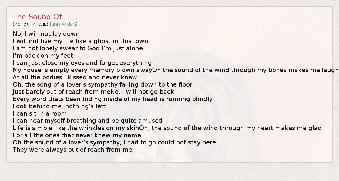 No, I will not lay down I will not live my life like a ghost in this town I am not lonely swear to God I'm just alone I'm back on my feet I can just close my eyes and forget everything My house is empty every memory blown awayOh the sound of the wind through my bones makes me laugh At all the bodies I kissed and never knew Oh, the song of a lover's sympathy falling down to the floor Just barely out of reach from meNo, I will not go back Every word thats been hiding inside of my head is running blindly Look behind me, nothing's left I can sit in a room I can hear myself breathing and be quite amused Life is simple like the wrinkles on my skinOh, the sound of the wind through my heart makes me glad For all the ones that never knew my name Oh the sound of a lover's sympathy, I had to go could not stay here They were always out of reach from me