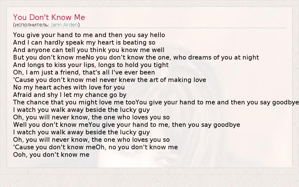 You give your hand to me and then you say hello And I can hardly speak my heart is beating so And anyone can tell you think you know me well But you don't know meNo you don't know the one, who dreams of you at night And longs to kiss your lips, longs to hold you tight Oh, I am just a friend, that's all I've ever been 'Cause you don't know meI never knew the art of making love No my heart aches with love for you Afraid and shy I let my chance go by The chance that you might love me tooYou give your hand to me and then you say goodbye I watch you walk away beside the lucky guy Oh, you will never know, the one who loves you so Well you don't know meYou give your hand to me, then you say goodbye I watch you walk away beside the lucky guy Oh, you will never know, the one who loves you so 'Cause you don't know meOh, no you don't know me Ooh, you don't know me