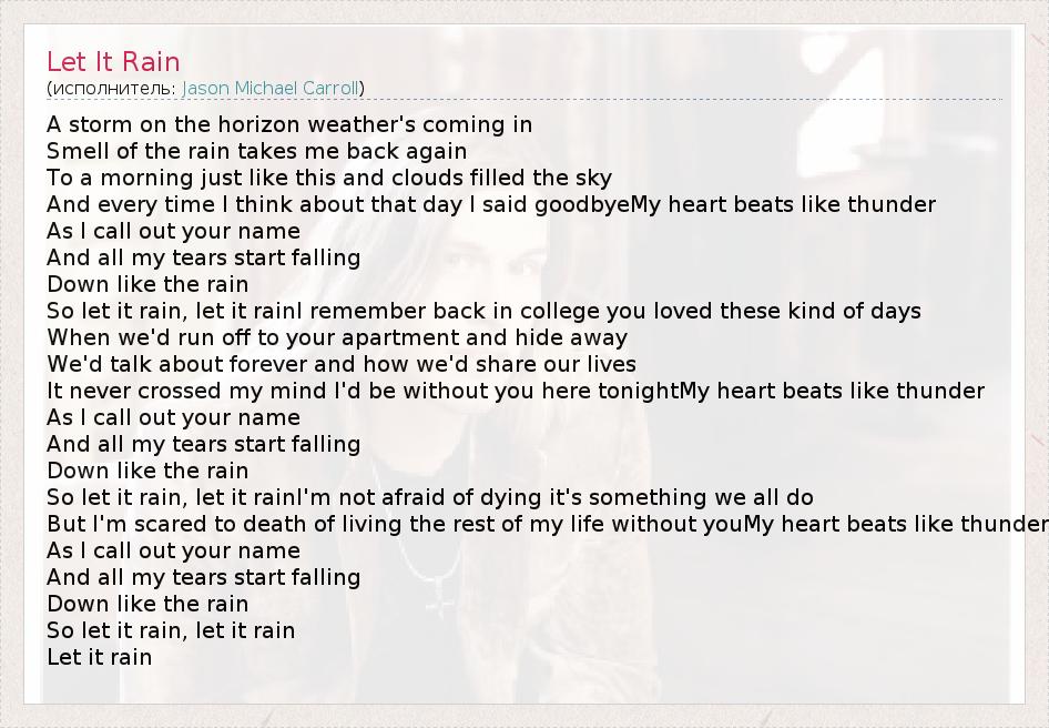 A storm on the horizon weather's coming in Smell of the rain takes me back again To a morning just like this and clouds filled the sky And every time I think about that day I said goodbyeMy heart beats like thunder As I call out your name And all my tears start falling Down like the rain So let it rain, let it rainI remember back in college you loved these kind of days When we'd run off to your apartment and hide away We'd talk about forever and how we'd share our lives It never crossed my mind I'd be without you here tonightMy heart beats like thunder As I call out your name And all my tears start falling Down like the rain So let it rain, let it rainI'm not afraid of dying it's something we all do But I'm scared to death of living the rest of my life without youMy heart beats like thunder As I call out your name And all my tears start falling Down like the rain So let it rain, let it rain Let it rain