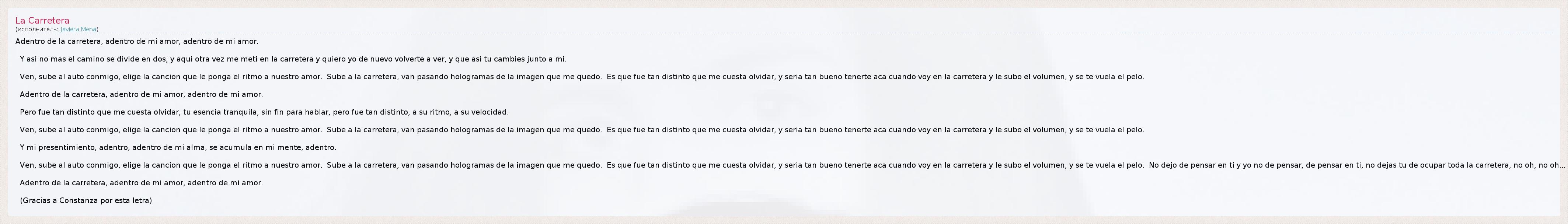 Ven, sube al auto conmigo, elige la cancion que le ponga el ritmo a nuestro amor.  Sube a la carretera, van pasando hologramas de la imagen que me quedo.  Es que fue tan distinto que me cuesta olvidar, y seria tan bueno tenerte aca cuando voy en la carretera y le subo el volumen, y se te vuela el pelo.