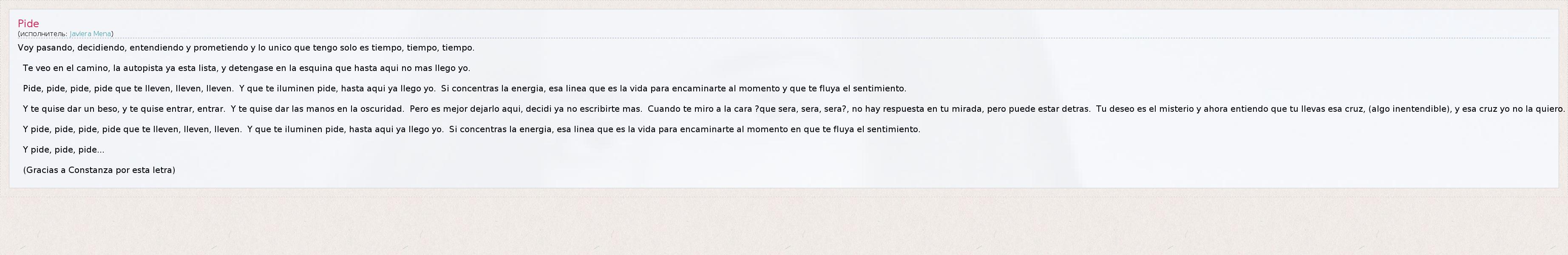 Pide, pide, pide, pide que te lleven, lleven, lleven.  Y que te iluminen pide, hasta aqui ya llego yo.  Si concentras la energia, esa linea que es la vida para encaminarte al momento y que te fluya el sentimiento.