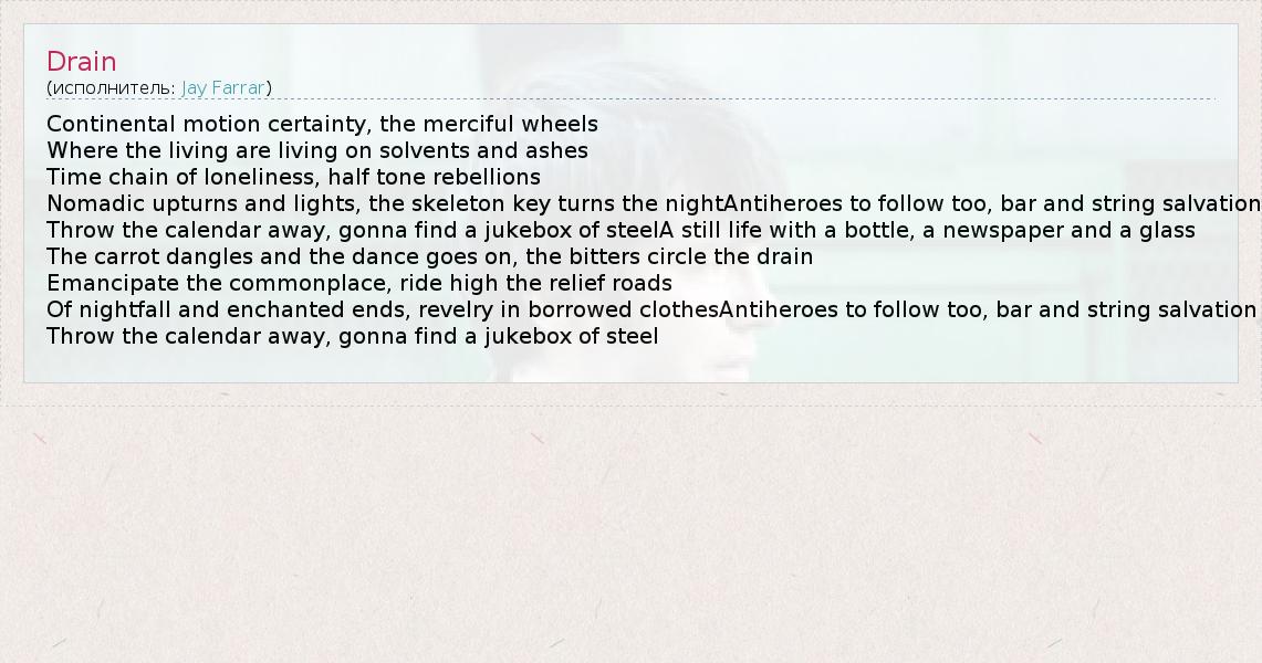 Continental motion certainty, the merciful wheels Where the living are living on solvents and ashes Time chain of loneliness, half tone rebellions Nomadic upturns and lights, the skeleton key turns the nightAntiheroes to follow too, bar and string salvation Throw the calendar away, gonna find a jukebox of steelA still life with a bottle, a newspaper and a glass The carrot dangles and the dance goes on, the bitters circle the drain Emancipate the commonplace, ride high the relief roads Of nightfall and enchanted ends, revelry in borrowed clothesAntiheroes to follow too, bar and string salvation Throw the calendar away, gonna find a jukebox of steel