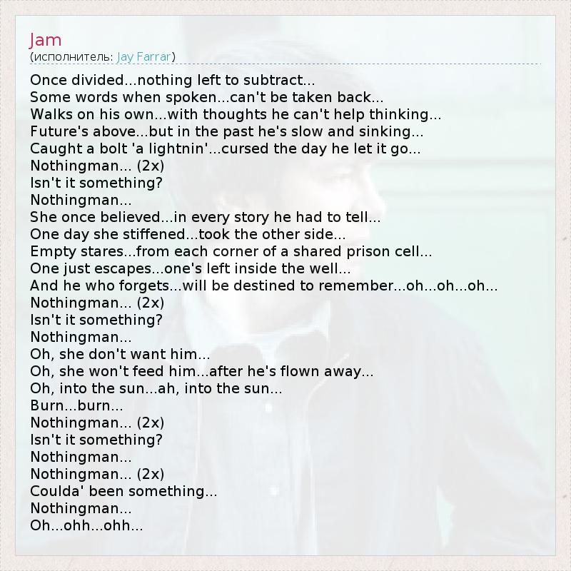 Once divided...nothing left to subtract... Some words when spoken...can't be taken back... Walks on his own...with thoughts he can't help thinking... Future's above...but in the past he's slow and sinking... Caught a bolt 'a lightnin'...cursed the day he let it go... Nothingman... (2x) Isn't it something? Nothingman... She once believed...in every story he had to tell... One day she stiffened...took the other side... Empty stares...from each corner of a shared prison cell... One just escapes...one's left inside the well... And he who forgets...will be destined to remember...oh...oh...oh... Nothingman... (2x) Isn't it something? Nothingman... Oh, she don't want him... Oh, she won't feed him...after he's flown away... Oh, into the sun...ah, into the sun... Burn...burn... Nothingman... (2x) Isn't it something? Nothingman... Nothingman... (2x) Coulda' been something... Nothingman... Oh...ohh...ohh...